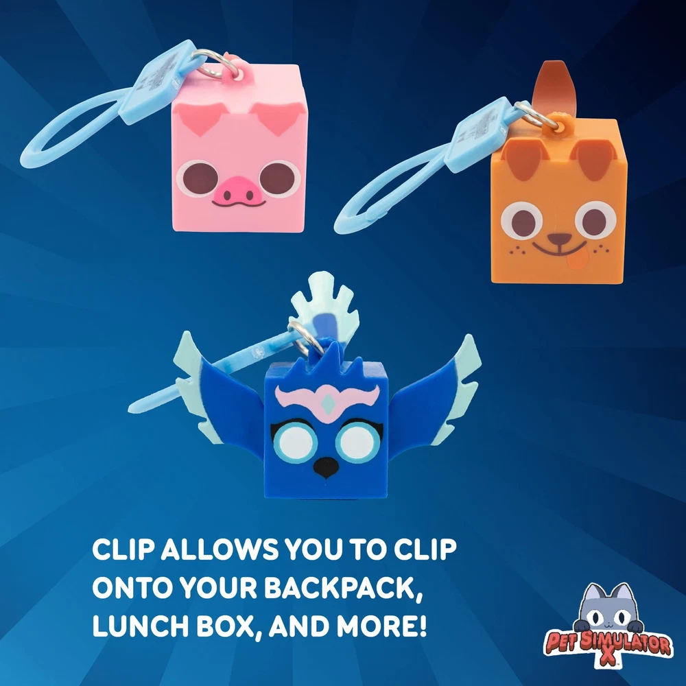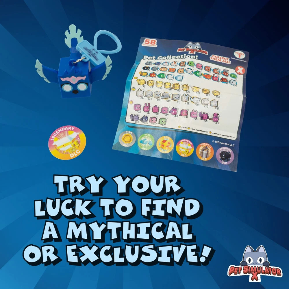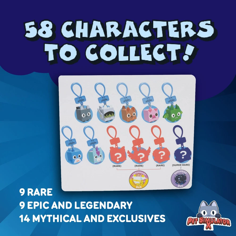 SUPRISES IN EACH BLIND BAG: Each pack contains 1 random character with collector clips and has a chance of an exclusive DLC Code but is not guaranteed MYSTERY PET SIMULATOR X: Series 1 contains 58 total minifigure pets to collect, including 13 Mythical and Exclusives, 9 Epic and Legendary, 9 Rare, and 27 Basic pets COLLECT THEM ALL: Rare Pets include Legendary DLC (1 in 8) and Super-Rare Pets include Exclusive DLC (1 in 96) Cute Keychain, Backpack Pendant, or Pet Simulator X accessories for Kids Girls Boys Ages 6 and up TAKE YOUR STYLE NEXT LEVEL: Attach the clip to any backpack or keychain and show off your Pet Simulator where ever you go. Pet Simulator: Genuine Pet Simulator X merchandise by PhatMojo.