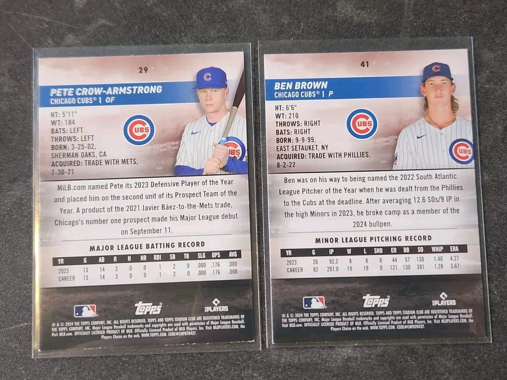 PETE CROW-ARMSTRONG/BEN BROWN 2-CARD RC LOT 2024 Stadium Club RED FOIL CUBBIES
