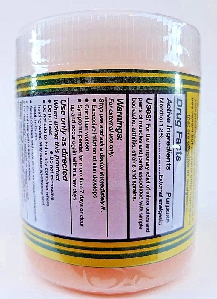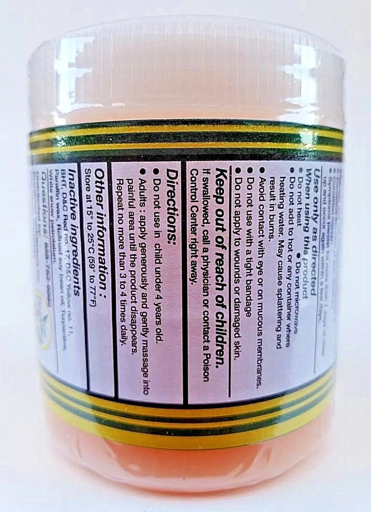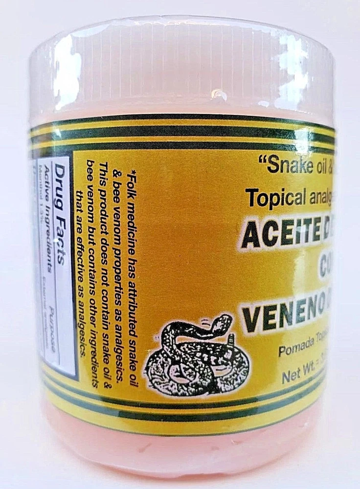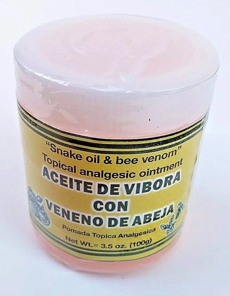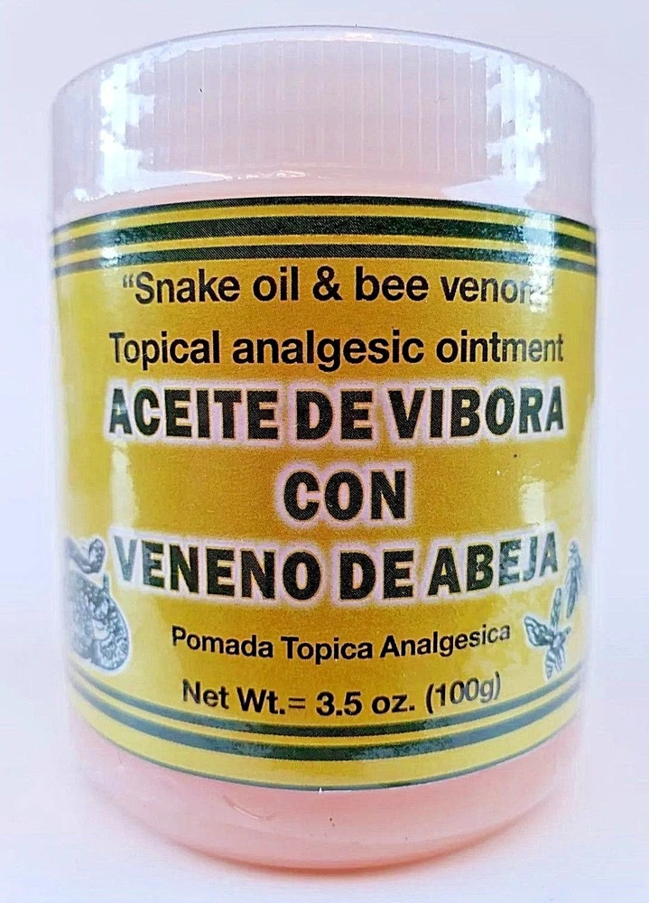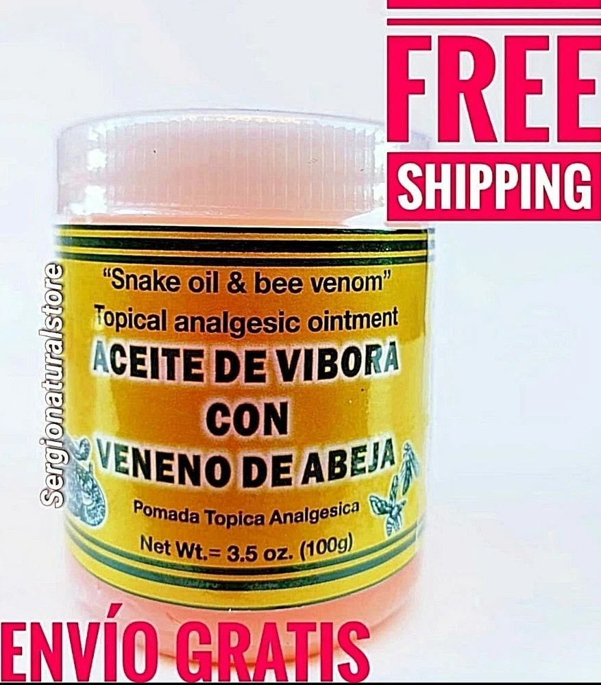 SNAKE OIL & BEE VENOM OINTMENT 3.5 oz. each Support for Sprains Dislocations Cramps Support Free Shipping Adults Apply generously and gently massage into painful area until the product disappears. Repeat no more than 3 to 4 times day. 100% Original Product Thank you for your support and preference, I invite you to see my other sales items. Buy with confidence !!You shipments is 100% Guaranteed!! ACEITE de VIBORA Y VENENO de ABEJA Pomada 100 grs Soporte para Esguinces Soporte Dislocaciones Calambres Envio Gratis Adultos Aplique generosamente y masajee suavemente en el área adolorida hasta que el producto desaparezca. Repita no más de 3 a 4 veces al día. P roducto 100% Original Muchas Gracias por su apoyo y preferencia, lo invito a mirar mis otros artículos de venta. Compre con confianza !!Su envío es 100% Garantizado!!