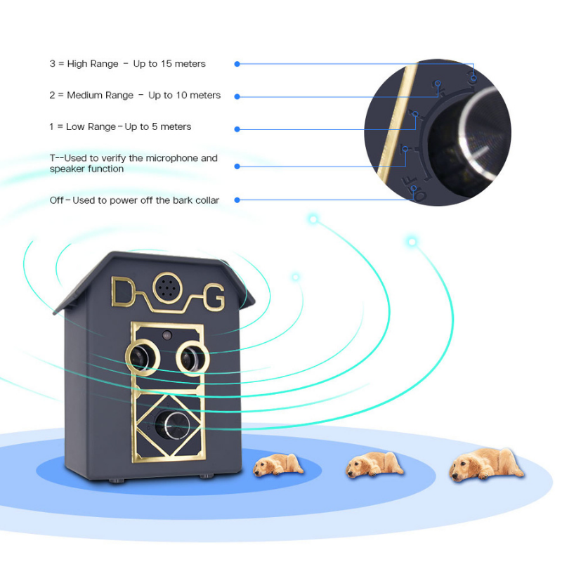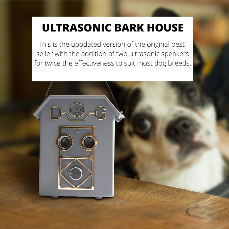 DESCRIPTION Stop nuisance barking without using a collar with the newest version of the global bestselling ultrasonic bark deterrent. The UL20 Ultrasonic Bark House has two ultrasonic speakers which effectively doubles the intensity of the original bark house model. The device detects barking up to 15 metres away then emits ultrasonic sound that is irritating to the dog but quiet to humans. The dog will quickly associate the ultrasonic sound to barking, which will stop or significantly reduce unwanted barking. This is safe, fast and efficient. You are able to target multiple dogs with one device! 9v battery is included in every box. UL20 Ultrasonic Bark Deterrent Features: Uses ultrasonic sound to deter unwanted barking Detects the sound of barking up to 15 meters 4 levels of operation including test mode , 3 range levels , On/Off switch 9v battery is included in every box Durable and weatherproof for outdoor use. Safe for indoor use. LED power/low battery indication.
