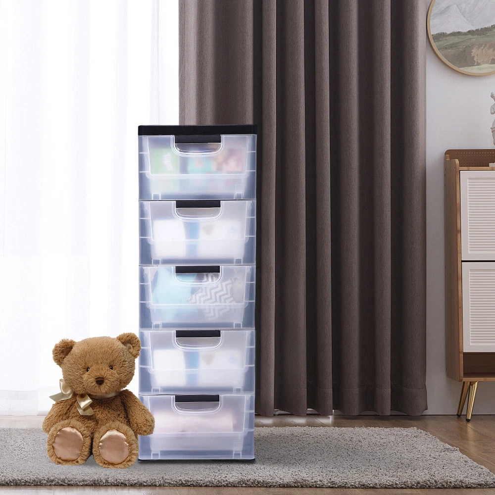 Description Beautiful living starts with organized storage. This storage cabinet with 5 drawers has more space at your disposal. It features a drawer design that can be pulled out smoothly. The transparent color is designed to make it easier for you to remember and find, giving you a better storage experience. Material: PP Color: Transparent Net Weight: 4.1kg/9.04lbs Product Size: 30*40*84cm/11.81*15.75*33.07in Each Layer Load-bearing Capacity: 7-10kg/15.43-22.05lbs Smooth Wheels: The four wheels at the bottom are made of high-qualityPP, so they are smooth and delicate. The smooth wheels run with little noise, providing you with a quiet experience. Snap: The bottom of each drawer is designed with snaps to prevent the drawer from slipping when you pull it, which is very thoughtful. PP Plastic Storage Cabinet 5 Drawers Stackable Clothes Storage Box Organizer HOT De scription This storage cabinet with 5 drawers has more space at your disposal. It features a drawer design that can be pulled out smoothly. The transparent color is designed to make it easier for you to remember and find, giving you a better storage experience. Key Features Compartmentalized Design : You can keep clothes, towels and other items in separate dedicated drawers to reduce cross-contamination. The transparent color partition design is more convenient and easier to find. Easy to Use : The storage cabinet with 5 drawers features a stacking design that allows you to combine and disassemble them as you need. Therefore, it is more convenient and applicable to a wider range than the one-piece type. Rounded Corners : It has rounded edges, which can effectively prevent you from accidentally touching and hurting yourself. Snap : The bottom of each drawer is designed with snaps to prevent the drawer from slipping when you pull it, which is very thoughtful. Drawer Handle : Each drawer is designed with a recessed handle for easy access to items. The rounded handle protects hands from scratches and is more aesthetically pleasing. Excellent Load-bearing Capacity : The thickened material ensures its excellent load-bearing capacity, so each drawer can carry 15.43-22.05lbs of weight. Therefore, you can store items with confidence. Flexible Movement : The bottom of the 5-drawer chest is equipped with four wheels , so you can easily move it from the living room to the bedroom. Application It is suitable for storing clothes, towels, toys and some other small items. Specification Material: PP Style: Modern Number of Layers: 5 Color: Transparent Each Layer Load-bearing Capacity: 7-10kg/15.43-22.05lbs Package Size: 41.5*39*33cm/16.34*15.35*13in Product Size: 30*40*84cm/11.81*15.75*33.07in Gross Weight: 4.7kg/10.36lbs Net Weight: 4.1kg/9.04lbs Package Included 1* Storage Cabinet 5 * Drawers Details Thicker Top Plate : It has a thicker top plate, which gives it a stronger load-bearing capacity. Therefore, you can put cups, small potted plants and other miscellaneous things on the top plate. Smooth Wheels : The four wheels at the bottom are made of high-quality PP, so they are smooth and delicate. The smooth wheels run with little noise, providing you with a quiet experience. Drawer Type : It is designed with drawer type, which is smooth to pull and more convenient to acce ss. Large Capacity : It consists of five drawers and its size reaches 11.81*15.75*33.07in . It can meet almost all your personal belongings storage needs. Space-saving : The storage cabinet with 5 drawers fit nicely into the corners of your walls and closets, sliding effortlessly into seemingly useless tight spaces next to cabinets or refrigerators. Selected Material : It is made of high-quality PP material, so it is odorless and safe to use even for babies or sensitive people. Its excellent impact resistance makes this product sturdy and durable. Elegant Appearance : Fluid lines, smooth surface and transparent color create this elegant storage cabinet with 5 drawers. It will add an elegant, gorgeous touch to your home or office and is ideal for modern-style furniture. Easy to Clean : It is made of stain-resistant PP material. When it has stains on its surface, you only need to ri nse it with water and then wipe it with a soft cloth to make it look brand new. Notes Please allow the slight color difference caused by the shooting light and 1-3cm error due to manual measurement, and make sure you do not mind before you order. Payment Delivery details Terms of sales About us Contact us Payment We accept ebay payment ă Fees such as import duties, taxes are not included in the item price or shipping costs. These charges are the buyer's responsibility. Delivery details Shipping: 2-9 working days to: USA Terms of sales We maintain high standards of excellence and strive for hundred percent customer satisfaction. Feedback is very important to us. We hope that you contact us immediately before you give neutral or negative feedback, so that we can address your concerns. It is impossible to address issues if we do not know about them! About us Your satis faction is our ultimate goal. We work hard to earn your trust and future business. Our certified technicians have tested each item before shipping. The unit comes with 1 year limited warranty on all manufacturing defects. a) If you receive a defective item, you may return it or ask for a discount. Please contact us within 14 days after you receive the package. b) What you returned must be intact and in its original packaging as re? u. Customer is responsible for shipping costs of the returned item. c) We will cover the cost of shipping back t with the shipping rate indicated in the registration page. We will send you a new unit or refund the full payment you paid. Thank you. Contact us Business Hour Business Hour: Monday To Friday: 8:30 AM to 5:00 PM (Beijing China time) Due to time zones, our reply to your questions may not be immediately. But within above working time, we will reply your email within 24 hours. If it's non-workdays, p