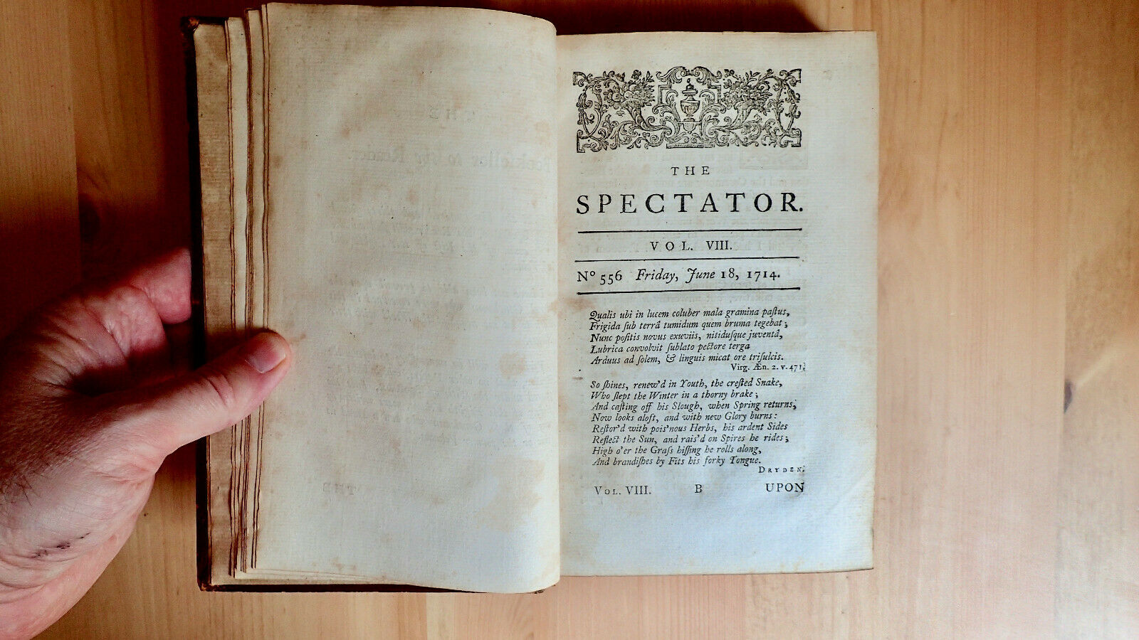 Up for auction is a volume of The Spectator Volume The Eighth And Last London Printed for J. And R. Tonson and S. Draper 1747. This is Vol 8 only of a larger 8 vol set. This volume is unique in that it contains the bookplate of Lieutenant Colonel Cooper 2nd Somerset Militia. I was not able to find much on Lt. Cooper although I believe the Somerset Militia is an English Regiment with a long and illustrious history. Condition overall good: Bound in full leather expect scuffing to leather spine is dry. Internally age toning, light foxing still bound tightly. Contains dedication, and 429 pp. plus index. As always any questions feel free to ask. The Spectator was a daily publication founded by Joseph Addison and Richard Steele in England, lasting from 1711 to 1712. Each "paper", or "number", was approximately 2,500 words long, and the original run consisted of 555 numbers, beginning on 1 March 1711.[1] These were collected into seven volumes. The paper was revived without the involvement of Steele in 1714, appearing thrice weekly for six months, and these papers when collected formed the eighth volume. Eustace Budgell, a cousin of Addison's, and the poet John Hughes also contributed to the publication.