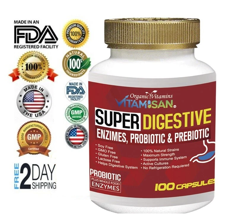 + TRACKING - Check your tracking package constantly to be aware of delivery. We offer free delivery using USPS new advantage it takes up to 9 to 10 days for delivery - Seller is not at fault of USPS carriers delays. Buyer has option at purchase to buy a PRIORITY label for sooner delivery. * NOTICE * - IF your address is a Cargo shipping agency address for delivery - Buyer is totally responsible for the delivery address/ Carriers and Sellers are NOT responsible for the delivery on Individuals that pick up delivery at those agencies!!! 100 CAPSULES SUPER DIGESTIVE ENZIME PROBIOTIC PREBIOTIC ORGANIC VITAMINS VITAMISAN ( T) great please check the pictures for ingredients Digestive Enzymes with Prebiotics & Probiotics Digestive Enzymes with Probiotics and Prebiotics, Daily Digestive Support Supplement, gluten of As a dietary supplement take one (2) capsule twice a day. For best results take 20-30 min before a meal or as directed by your healthcare professional. Shipping Free shipping via USPS First Class Returns Free 30-Day returns to ensure your satisfaction unopened bottles LEGAL DISCLAIMER ? The statements made herein have not been evaluated by the Food and Drug Administration. The products & the information provided on this web site are not intended to treat* diagnose*cure*prevent or mitigate any condition or disease. As always, consult with your health care professional before taking any-medication or nutritional supplement. NOTE this product is not intended to cure treat any medical condition. Must use for at least 60 days in advance and in constantly use or application. ? We offer 2-day shipping and handling to ship your item and we offer USPS first class service package will could result in 5-9 days depending on carrier for delivery - please note that EBAY estimated times are only an estimation date not accurate. THANK YOU WE APPRECIATE CONTACTING US IF ANY CONCERN FIRST! OUR CUSTOMER SERVICES IS ALWAYS TO HELP YOU Policies Returns: We offer free returns BUT The only items/ pack/ bottles to be eligible to returns are IF the bottle or item are closed and with seal or in NEW condition as received. We cannot accept opened or used items or partial used, we only accept complete and new items for a full refund.
