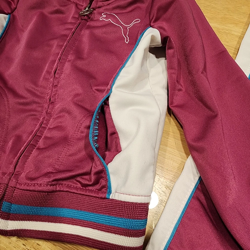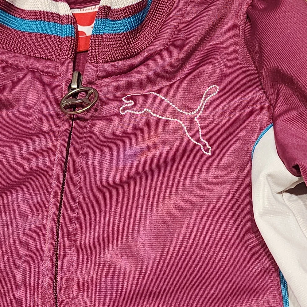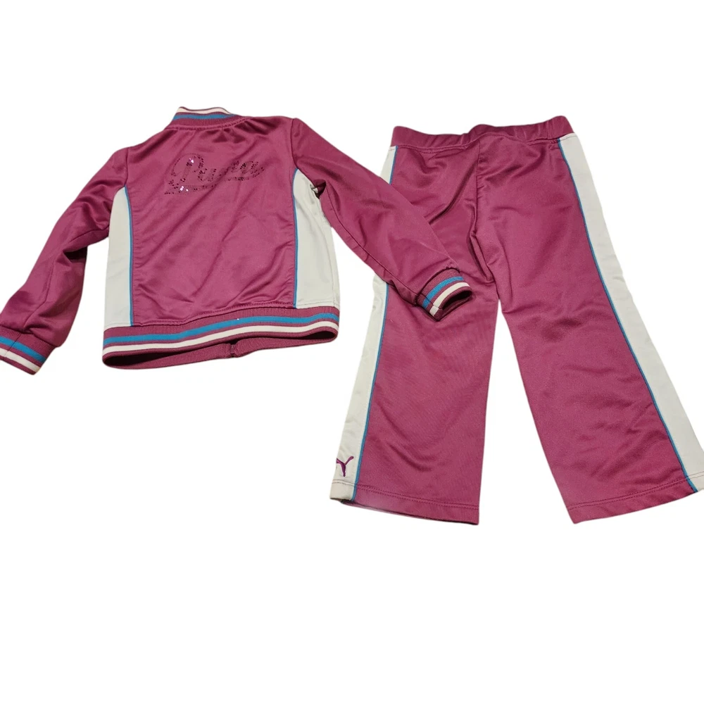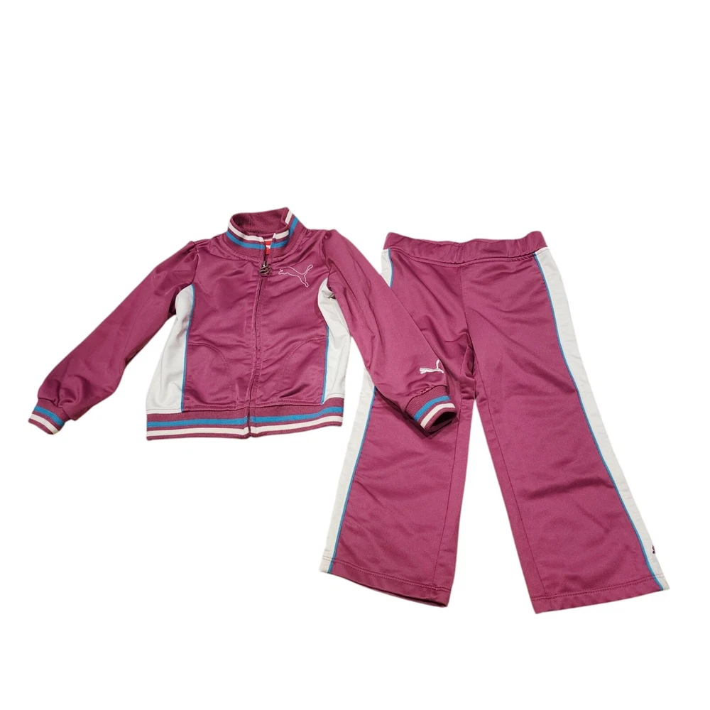 Dress your little one in comfort and style with the PUMA 2 Piece Track Suit, a perfect blend of functionality and casual wear. This adorable set includes a full-zip jacket and matching pants, both designed with a playful purple hue that's sure to stand out. The jacket features a convenient full zipper closure and pockets for practicality, while the pants offer a snug fit for active toddlers. Crafted with a blend of cotton and polyester, this outfit is both soft and durable, making it ideal for the energetic movements of little athletes. The set boasts PUMA's iconic 3 Stripes and logo accents for a touch of brand prestige, and the long sleeves make it suitable for cooler seasons like fall, spring, and winter. Whether it's for sports activities or casual outings, this track suit is a versatile addition to your child's wardrobe.