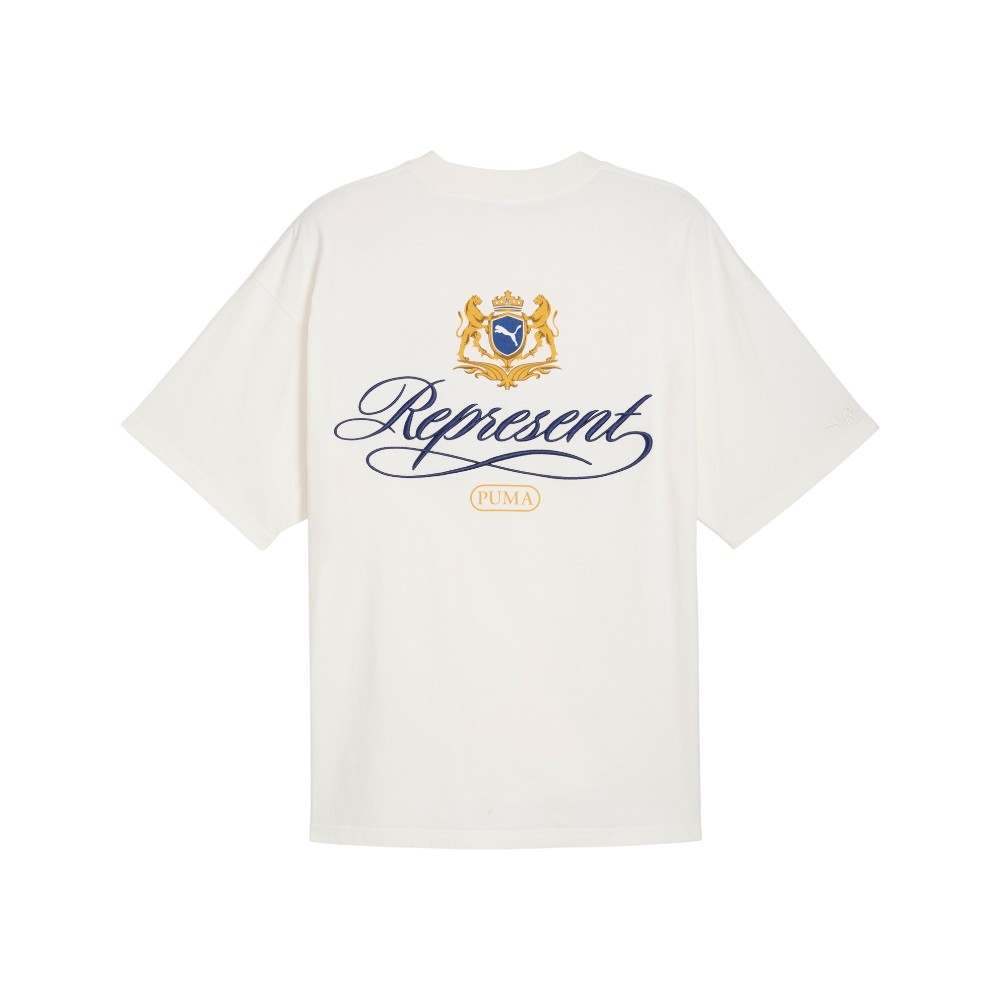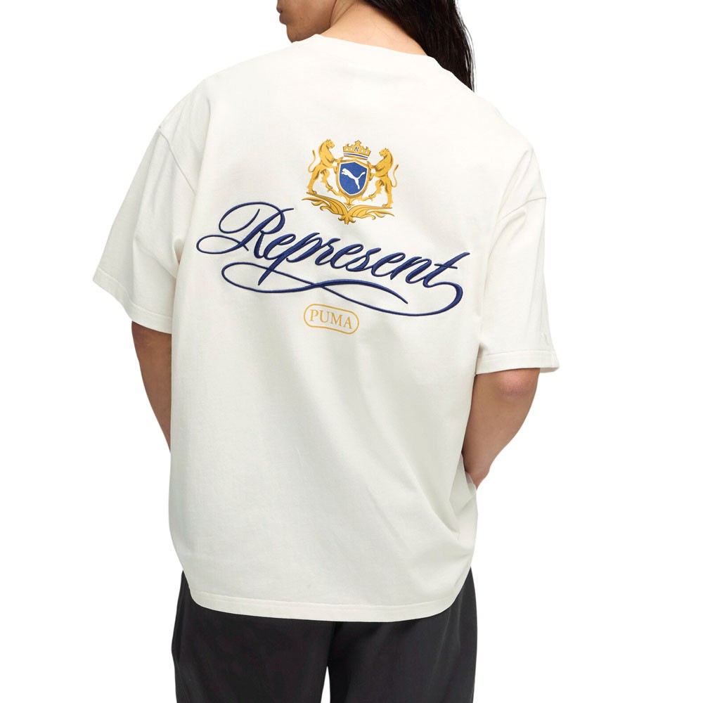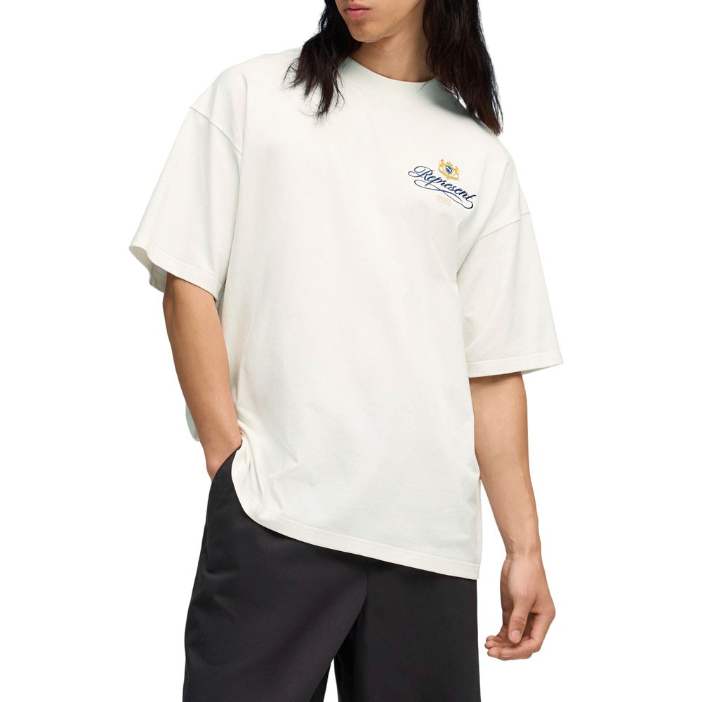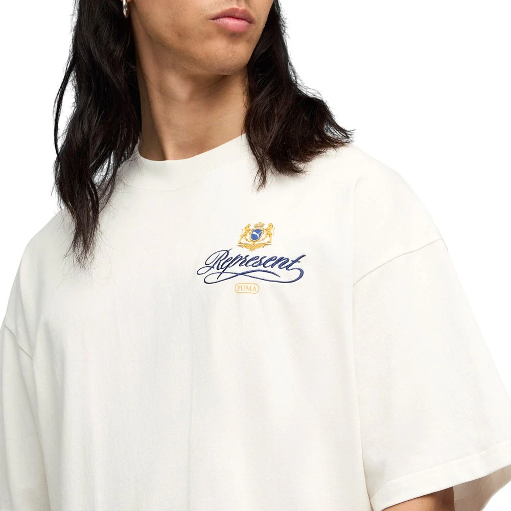 Represent Graphic Crew Neck Short Sleeve T-Shirt Product Details Oversized fit Crew neck Short sleeves PUMA Cat and REPRESENT logo embroidery on left sleeve Graphic print on chest and back Color: Shoji PUMA reunites with Represent for a collection that blends football heritage with contemporary luxury. Rooted in Represent’s British streetwear identity and PUMA’s sporting legacy, the range delivers refined pieces with considered details, alongside two archive footwear icons: the King Indoor and the Super Team. Additional Details Manufacturer Color: Shoji Color: White Occasion: Casual Gender: Mens Age: Adult Brand: