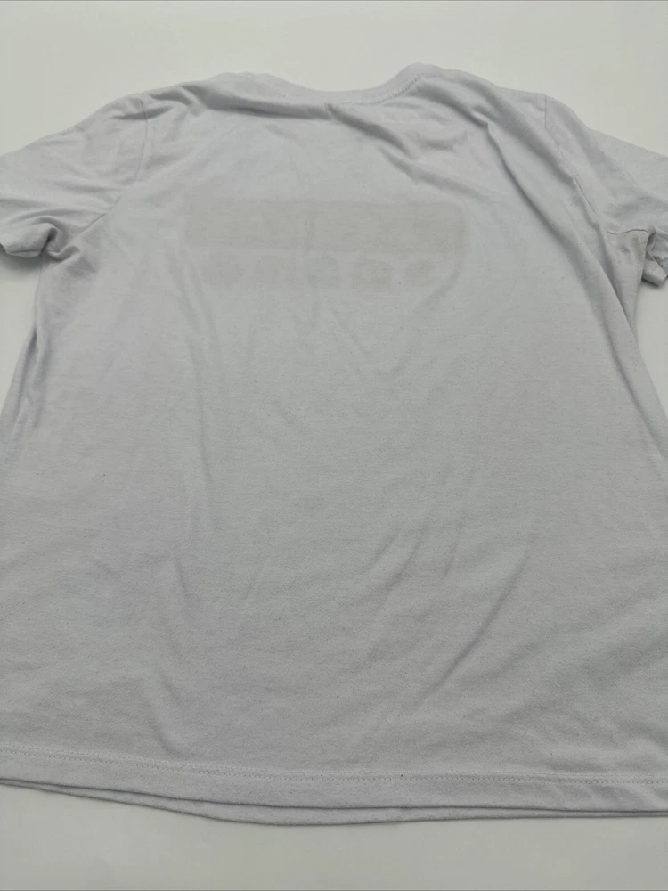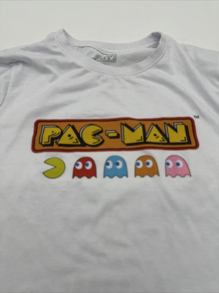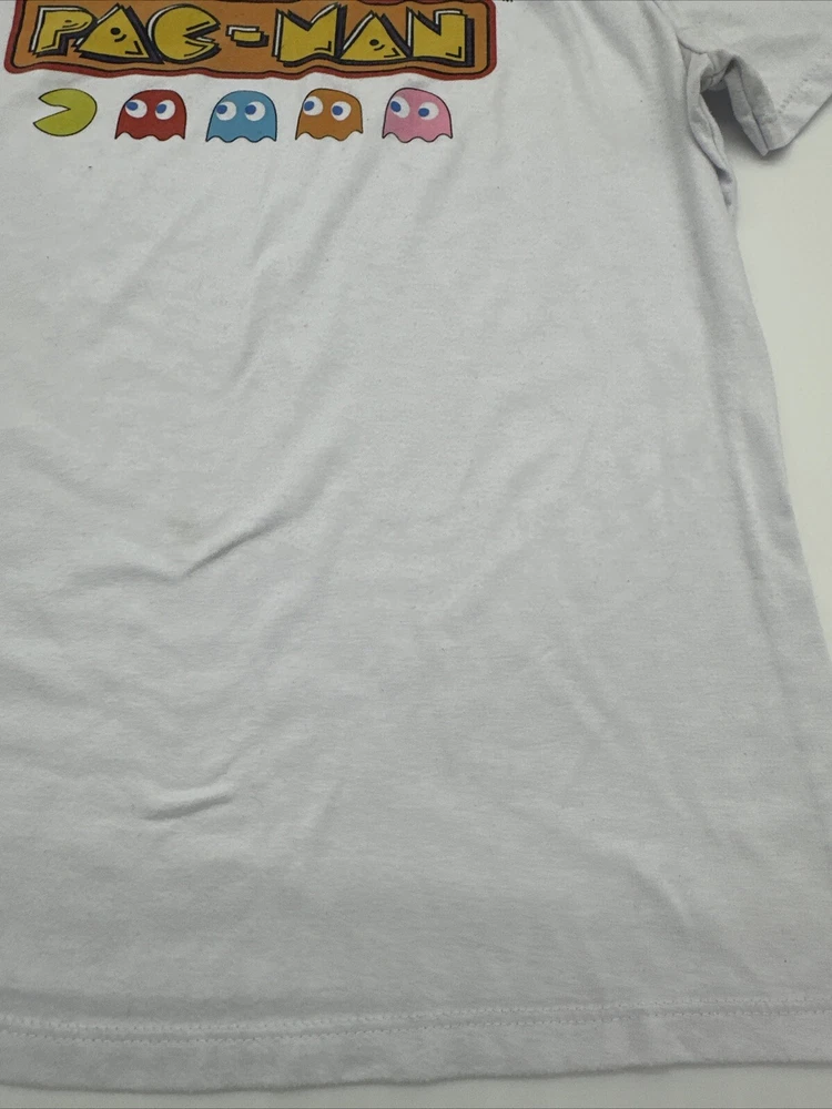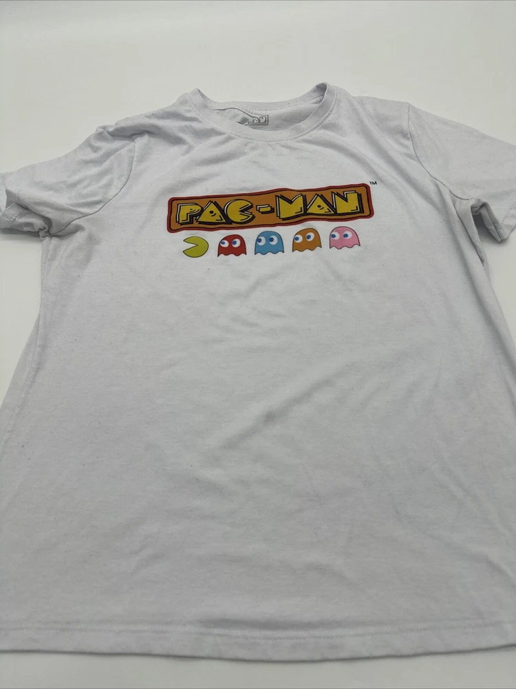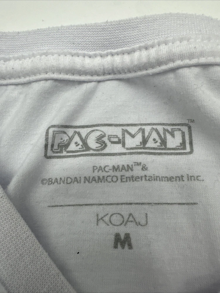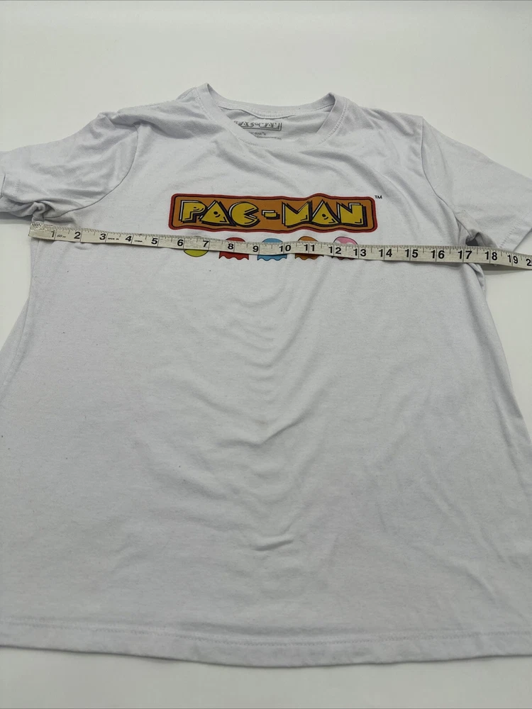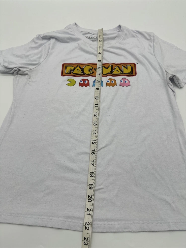 This Pac-Man T-Shirt for women is a must-have for any fan of the classic video game. It features a white graphic print of the beloved character and is made of a comfortable blend of polyester and cotton. The short sleeve T-shirt has a crew neck and a regular fit, making it perfect for casual wear. The size is medium and the brand is Koaj. The T-shirt is easy to care for and has no known flaws. It is a great addition to any wardrobe and can be paired with jeans or shorts for a fun and playful look. Get this Pac-Man T-Shirt today and show off your love for the iconic video game character! *Check the picture above for the flaws and measurements of the item.