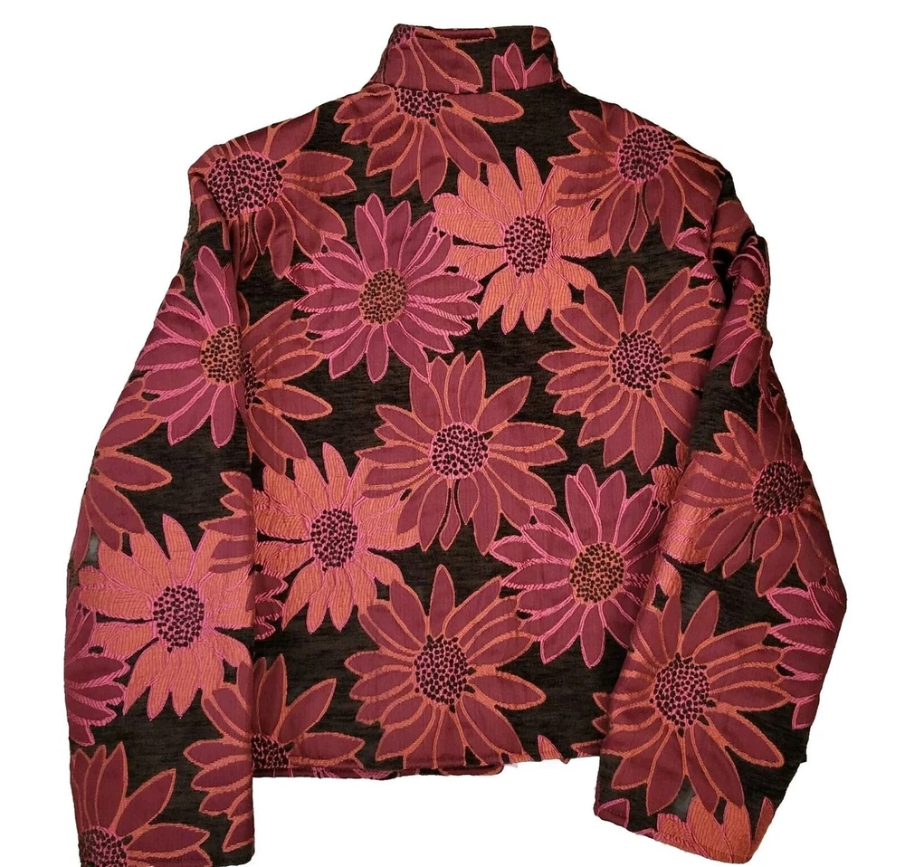 Size XL. Length 22". Pit to pit 23". Arm length from shoulder 30". In good preowned condition. Painted Pony Women's Tapestry Jacket is a must-have for any bohemian-inspired wardrobe. The multicolor brown, red, and orange floral pattern and quilted accents make it a unique piece that will make any outfit stand out. The jacket is made from a rayon blend knit fabric and features a collared neckline and shoulder pads for a comfortable fit. It is perfect for any occasion, whether for travel, casual wear, or work. The jacket is short and has long sleeves, making it suitable for any season. The lining is made from polyester.