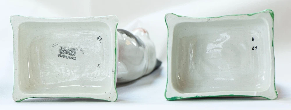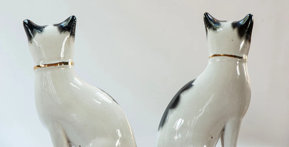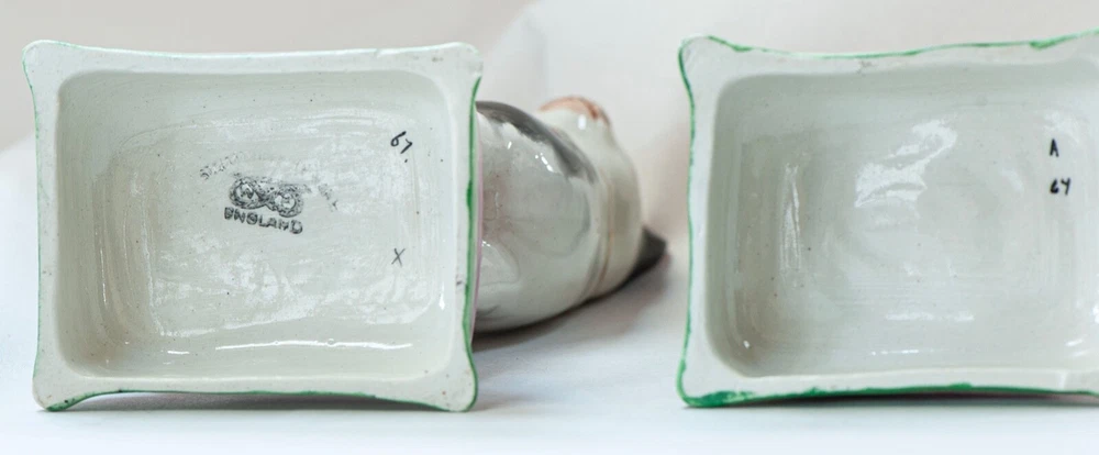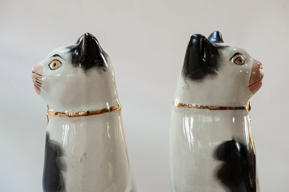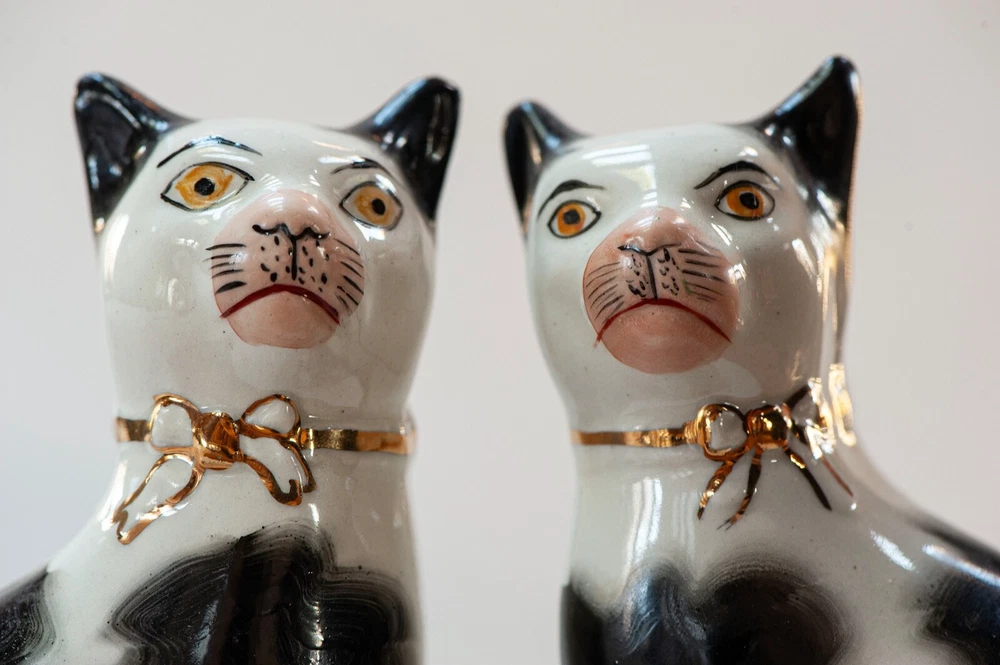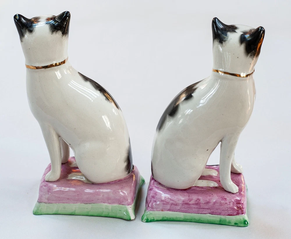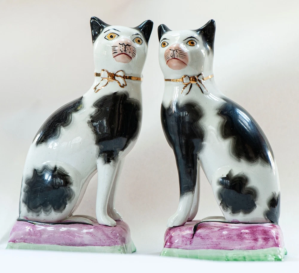 This is a stunning pair of antique Staffordshire porcelain mantle cats. Made in England, these cats bring a touch of elegance to any home decor. The intricate hand-painted details and unique colors of black, white, pink, green, and gold make these cats a true work of art. These mantle cats are a rare find and would make a valuable addition to any collection of other antiques. The cats are in excellent condition and have been well preserved over the years. Their style and design are perfect for adding a touch of old-world charm to any room in your home. Kept in curio cabinet. Each cat 7" tall 4" wide. No Crazing, cracks, or repairs. Shipped double boxed.