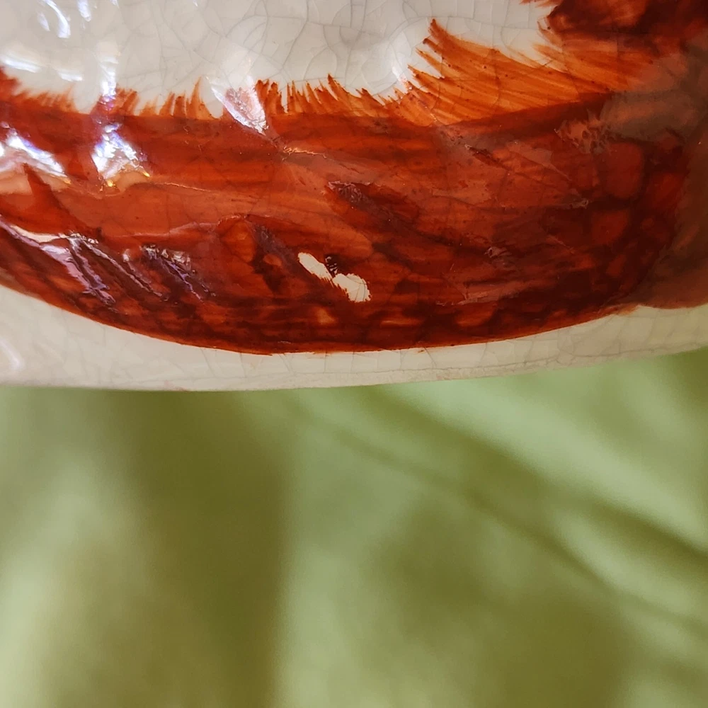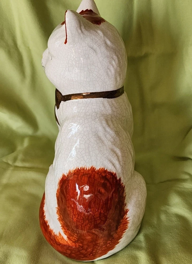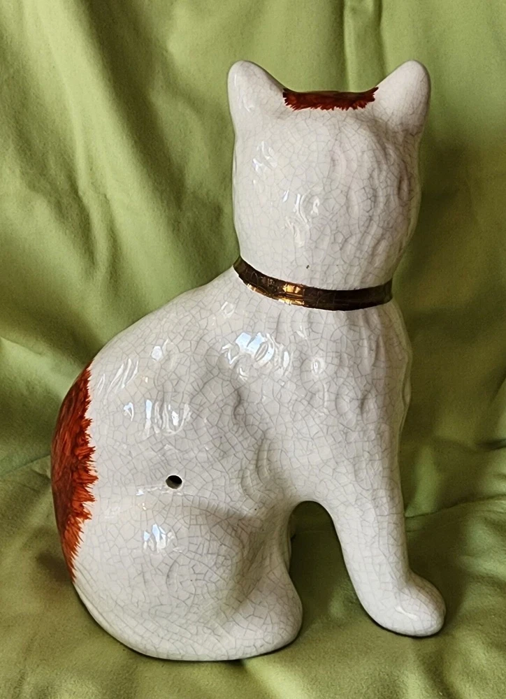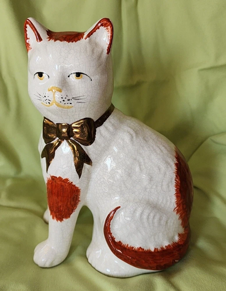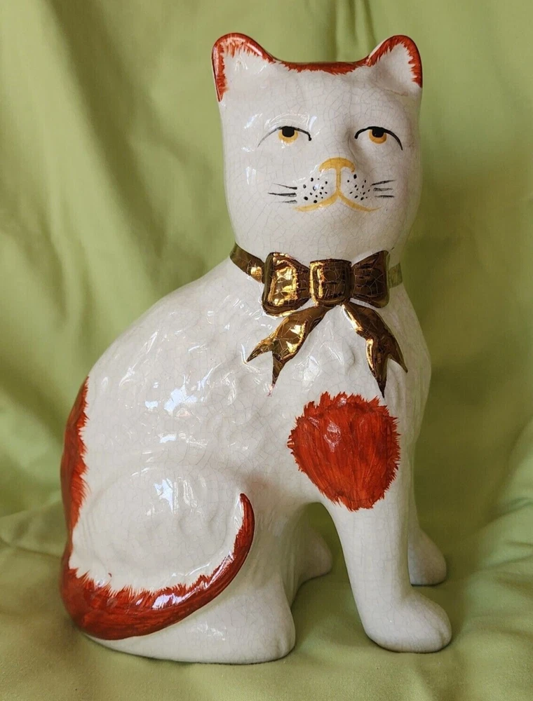 Pair of antique Staffordshire Ware Kent Ceramic Cat Figurines formantle or bookcase. Made/hand painted in Staffordshire England - unmarked. White with ginger/red coloring; shiny copper-color bows. In excellent used condition. All over fine crazing lines asusual for these figurines. All paint intact; one spot on tail of left-facingcat is a factory paint skip (as shown in photo). Please view all pictures as part of the description. Height: 8” Width: 6” Depth: 4” These are lovely and a charming addition to any décor –traditional, Victorian, Arts & Crafts, mid-Century – even whimsical for modern/contemporary. Enjoyed and displayed in a smoke-free home for many years.