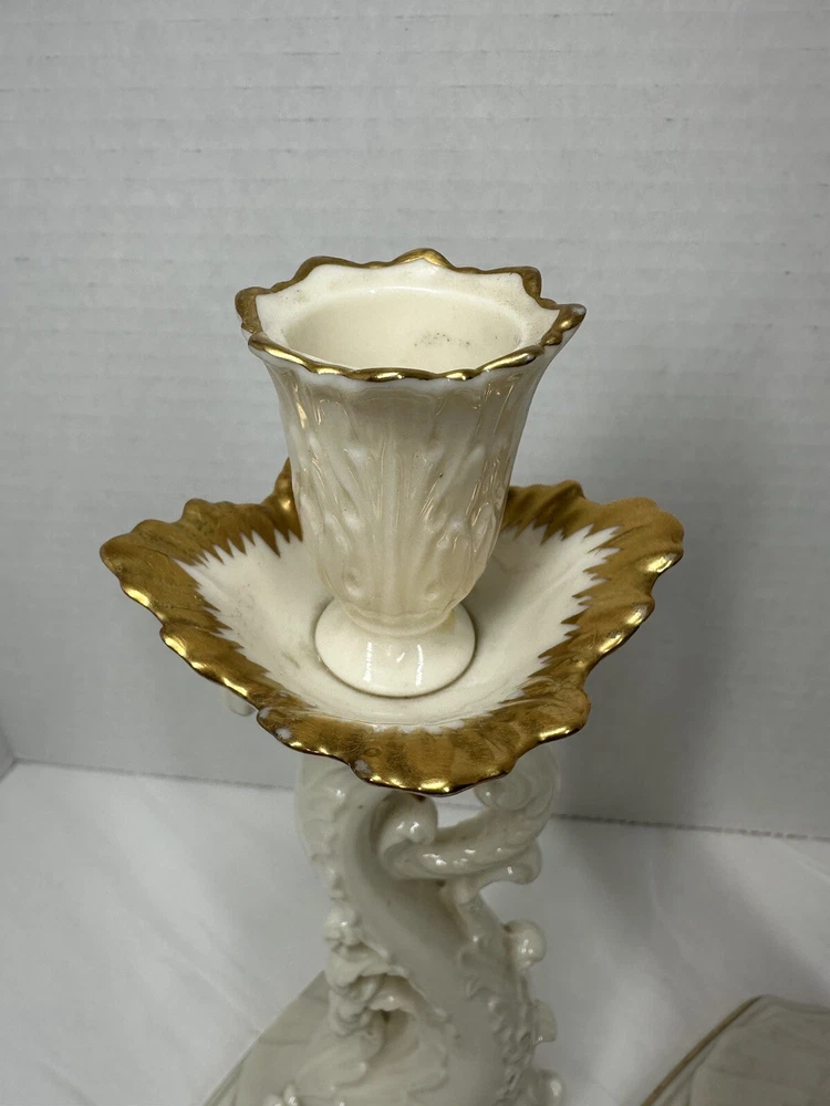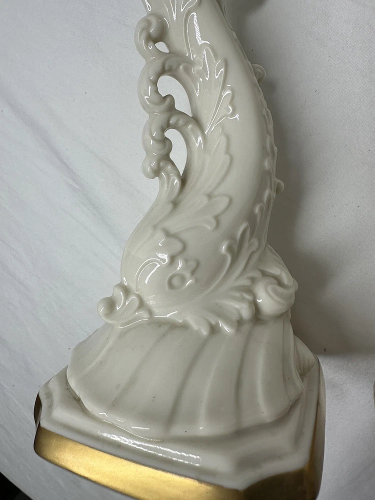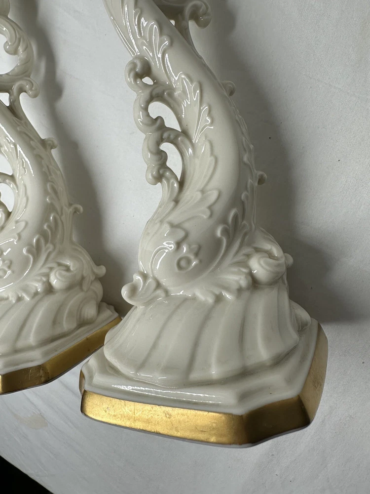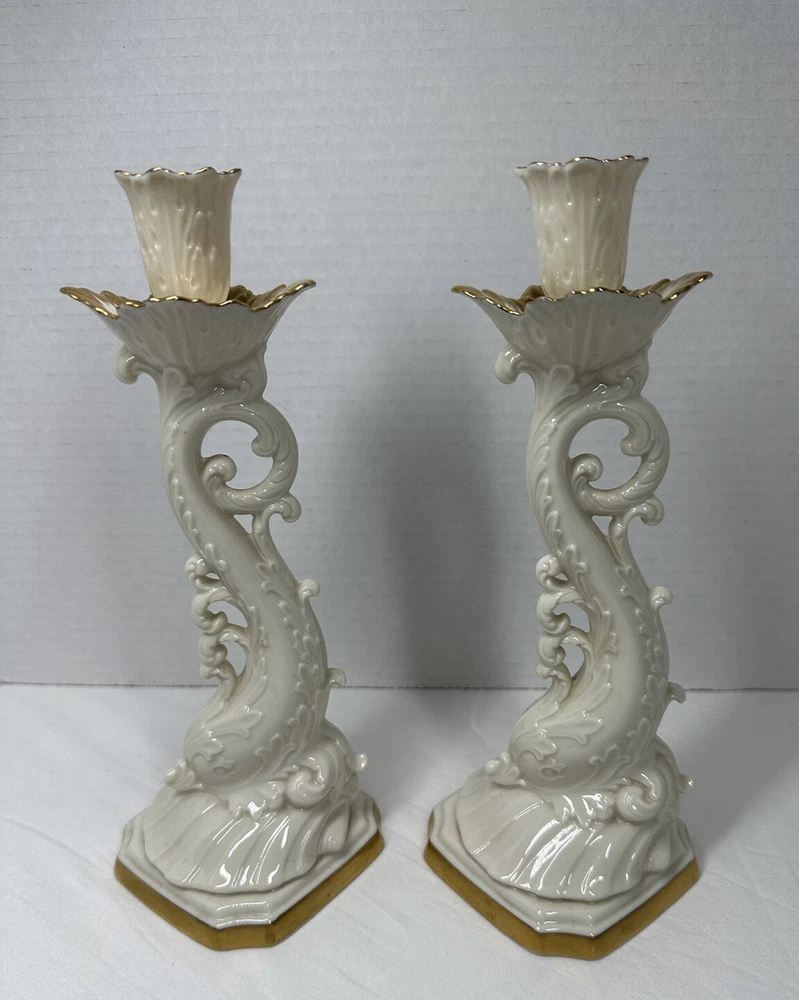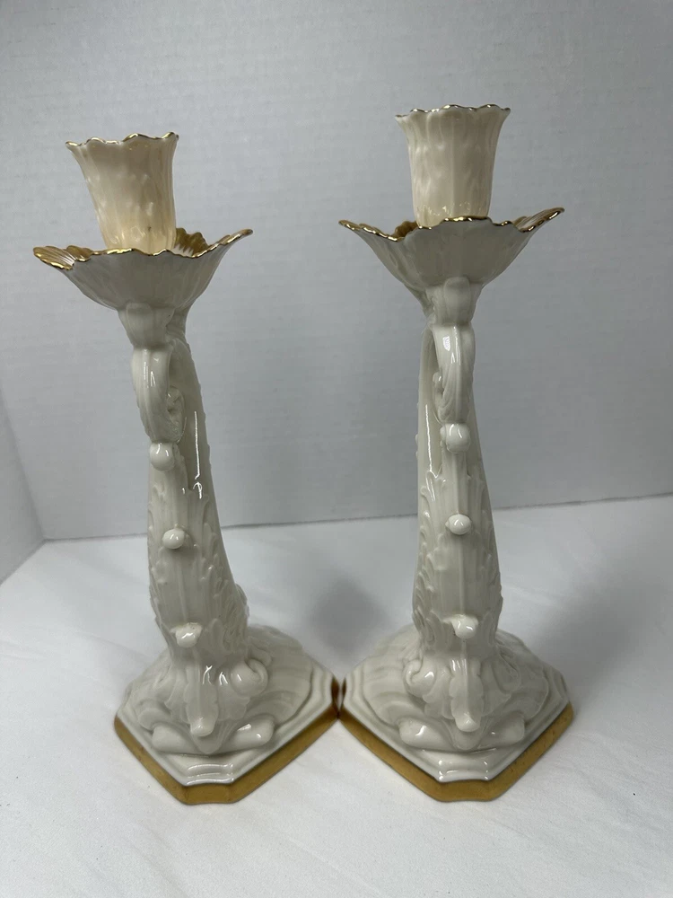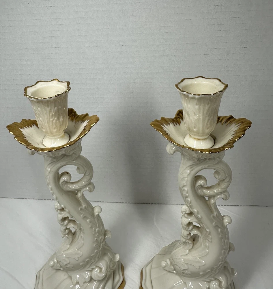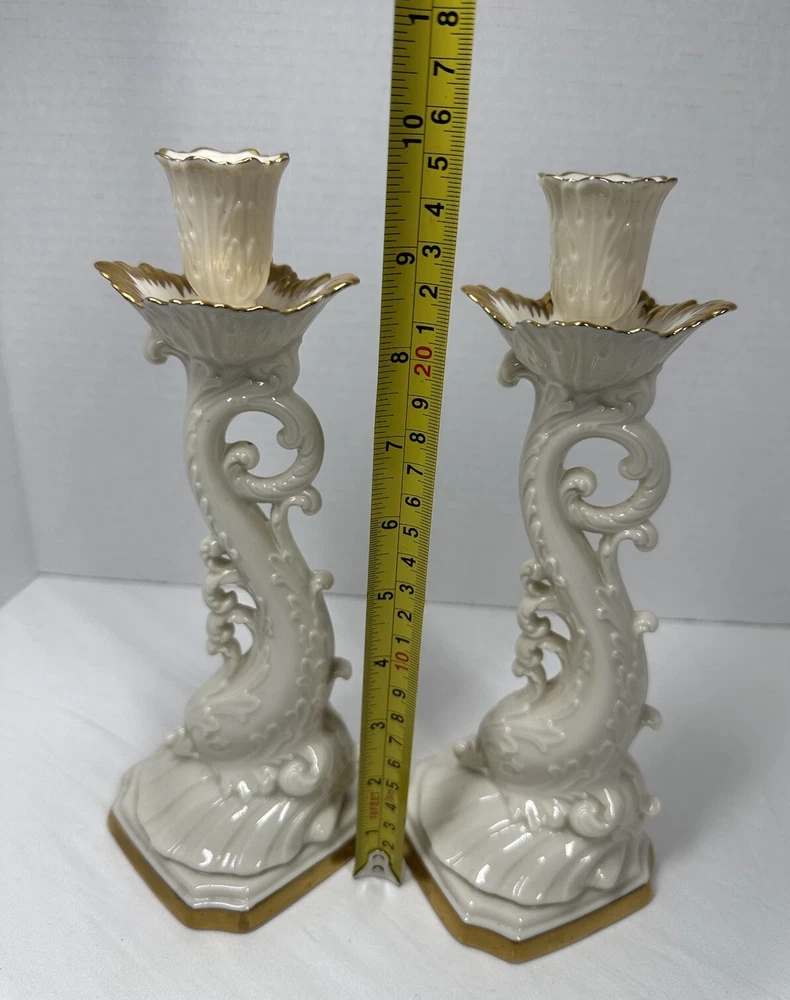 This is a pair of vintage Lenox candle holders featuring a dolphin design adorned with 24K gold trim. The candle holders stand at a tall 10 inches in height and width, with a glossy cream finish adding an elegant touch to the overall look. Perfect for collectors or those seeking decorative pieces with a touch of sophistication, these candle holders embody the classic Lenox quality and charm in their design.