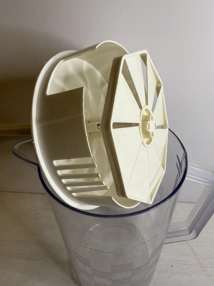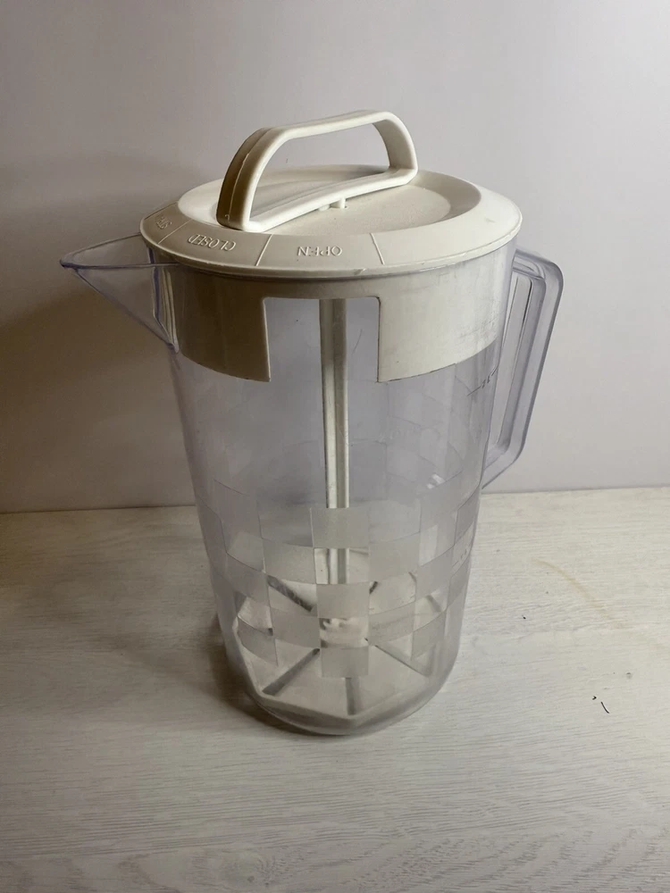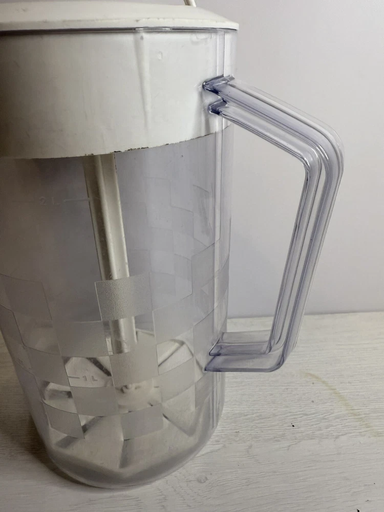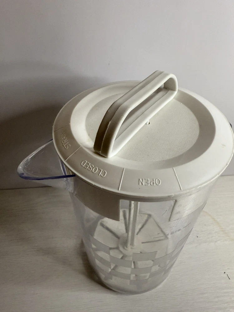 This Pampered Chef Quick Stir 2 QT Mixing Pitcher is a must-have for any kitchen. With its checkered pattern and glossy finish, it is perfect for all occasions. The pitcher is made of durable plastic and is dishwasher safe for easy cleaning. It features a lid and has a capacity of 2 quarts, making it perfect for mixing ingredients or serving beverages. The pitcher is manufactured in the United States and comes with a manufacturer warranty. This contemporary style pitcher is perfect for any home and is sure to impress guests.