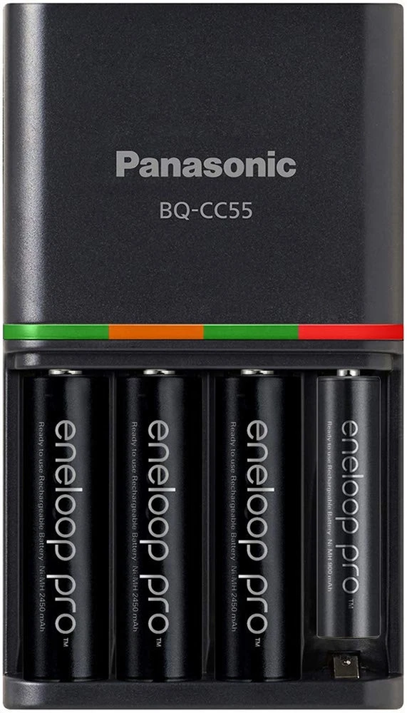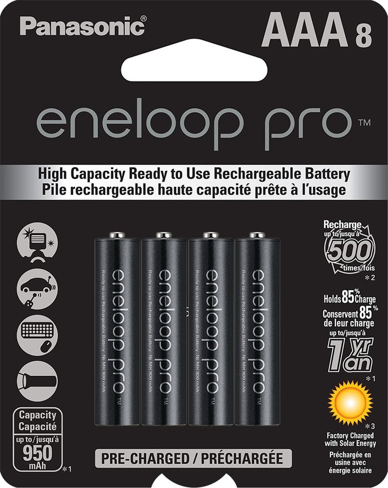 Eneloop Panasonic pro AAA Batteries (8-Pack) and Advanced pro 4 Hour Quick Charger Product Details Brand: Eneloop Battery Cell Composition: NiMH Unit Count: 1 Count Voltage: 1.2 Volts Reusability: Rechargeable Package Dimensions: 3 x 2.5 x 0.5 inches Item Weight: 3.2 ounces Date First Available: April 10, 2020 Contains 8 Panasonic eneloop pro AAA rechargeable batteries with up to 950mAh capacity. Can be recharged up to 500 times. Panasonic advanced eneloop pro charger can charge any combination of up to 4 AA/AAA batteries in 3 hours. eneloop pro batteries maintain up to 85% charge for up to 1 year and can be used in extreme temperatures down to -4F. LED indicators show charging status for each battery. Charging stops automatically when battery is fully charged. Includes retractable AC plug for easy storage and portability. Panasonic BK-4HCCA8BA eneloop pro AAA High Capacity Ni-MH Pre-Charged Rechargeable Batteries, 8 Pack Panasonic BK-4HCCA8BA eneloop pro High Capacity Ni-MH “Low Self Discharge” batteries utilize Panasonic's advanced rechargeable battery technology providing up to 2550mAh (AA batteries) / 950mAh (AAA) of power and the ability to be recharged up to 500 times. eneloop pro battery cells deliver consistent power performance, maintain 85% of their charge for up to one year, come pre-charged by solar power (at the factory) and are ready to use out of the package. These eneloop cells also have increased power, added storage life and extreme temperature performance down to -4 degrees Fahrenheit. Panasonic BQ-CC55KSBHA Advanced eneloop pro Rechargeable Battery 4 Hour Quick Charger with 4 LED Charge Indicator Lights, Black The Panasonic CC55 4-position Ni-MH battery charger can quickly and individually charge any combination of up to four AA or AAA eneloop pro rechargeable batteries in just 4 hours (one to two AA or AAA rechargeable batteries can be fully charged in up to just 2 hours) Four eneloop AA or AAA rechargeable batteries can be charged in up to 3 hours Individual charging means you can easily and efficiently charge from 1 to 4 batteries with differing levels of remaining charge A huge time saver! The CC55 charger also features 4 individual LED charge indicator lights Once rechargeable batteries are installed the charger measures each cell and the corresponding light indicates the remaining charge Green 80-100% Orange 20%-80% and Red 0%-20% After each battery reaches the next level of charging the LED light changes to indicate the cells charge level Once the rechargeable battery is completely charged the LED light turns off for that cell Ideal for use at home in the office or on the road this Panasonic CC55 charger is a quick and convenient way to recharge any combination of up to four AA or AAA Ni-MH eneloop pro eneloop or conventional Panasonic Ni-MH rechargeable batteries