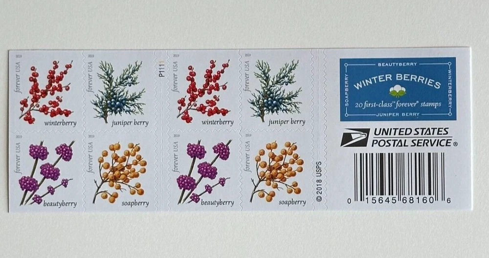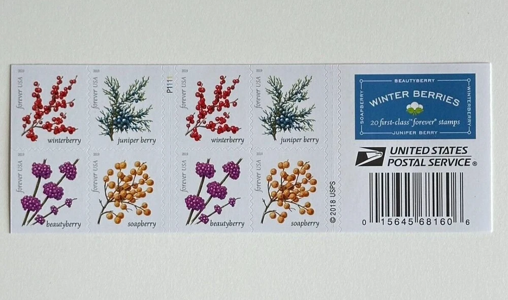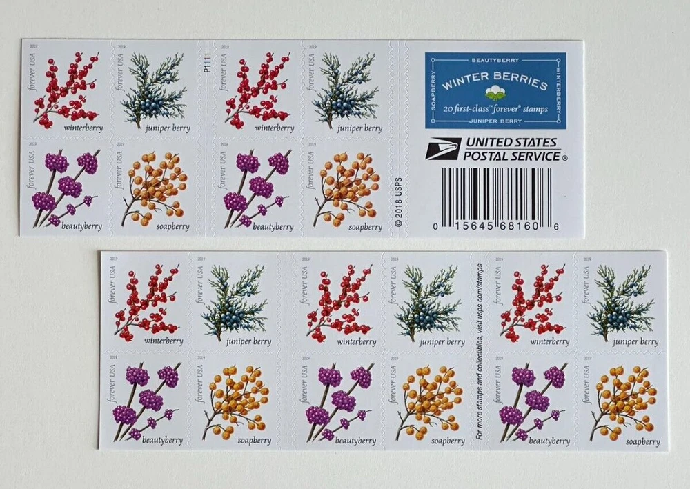 Winter Berries Book of 20 First Class Stamps Wedding Celebrate Engagement (20 Stamps) Brand new double-sided booklet of 20 4ever Stamps Alternating stamps feature the winterberry (Ilex verticillata), the juniper berry (Juniperus communis), the beautyberry (Callicarpa americana), and the soapberry (Sapindus saponaria) Self-stick adhesive stamps Fast and Free shipping From US