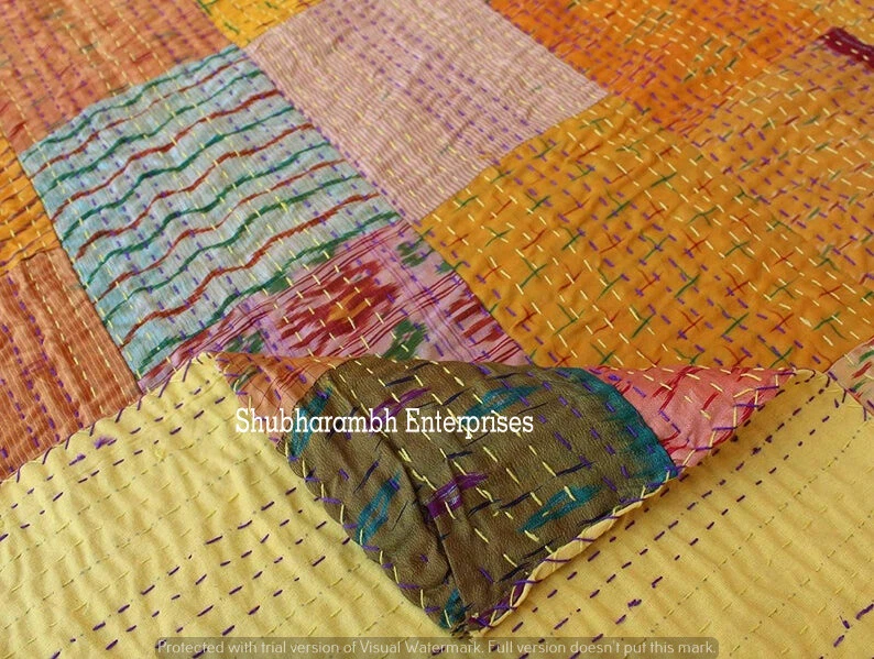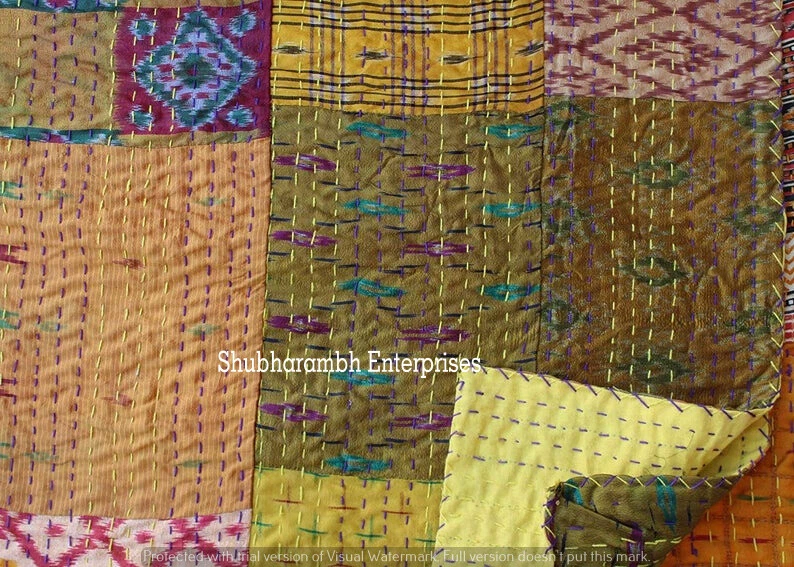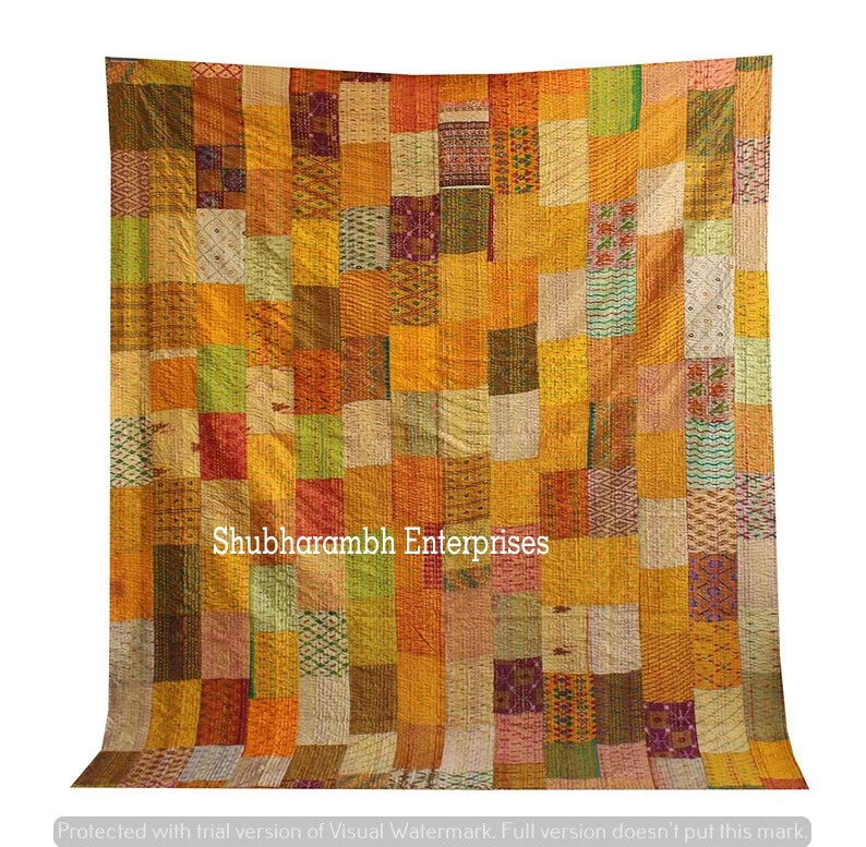 Patchwork Yellow Silk Kantha Quilt Bohemian Blanket Hippie Bedding Bedspread