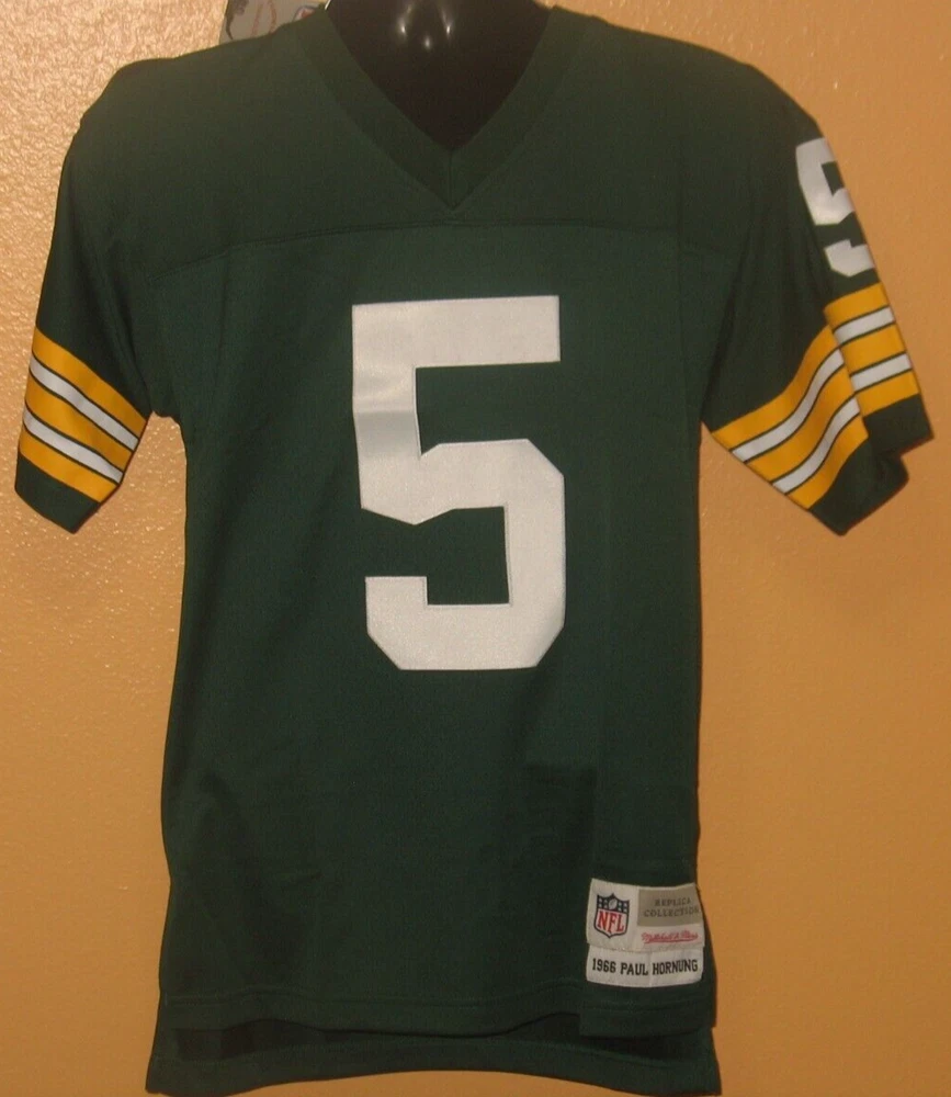 Here is an unworn, still New With Tags Mitchell & Ness Throwback Replica Collection Jersey for Paul Hornung #5 from the 1966 Green Bay Packers season's style. It is a size 36 Small, and is perfect for a Green Bay Packers fan! U.S. buyers will get free shipping! Please let me know if you have any questions! Thanks for checking out my items!