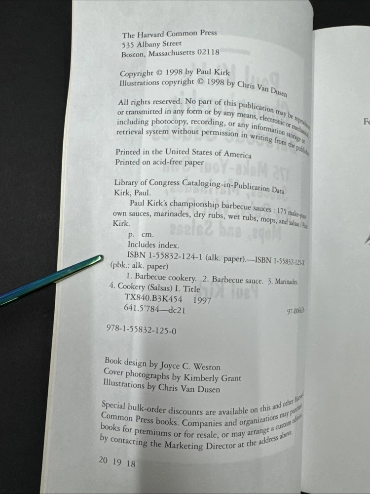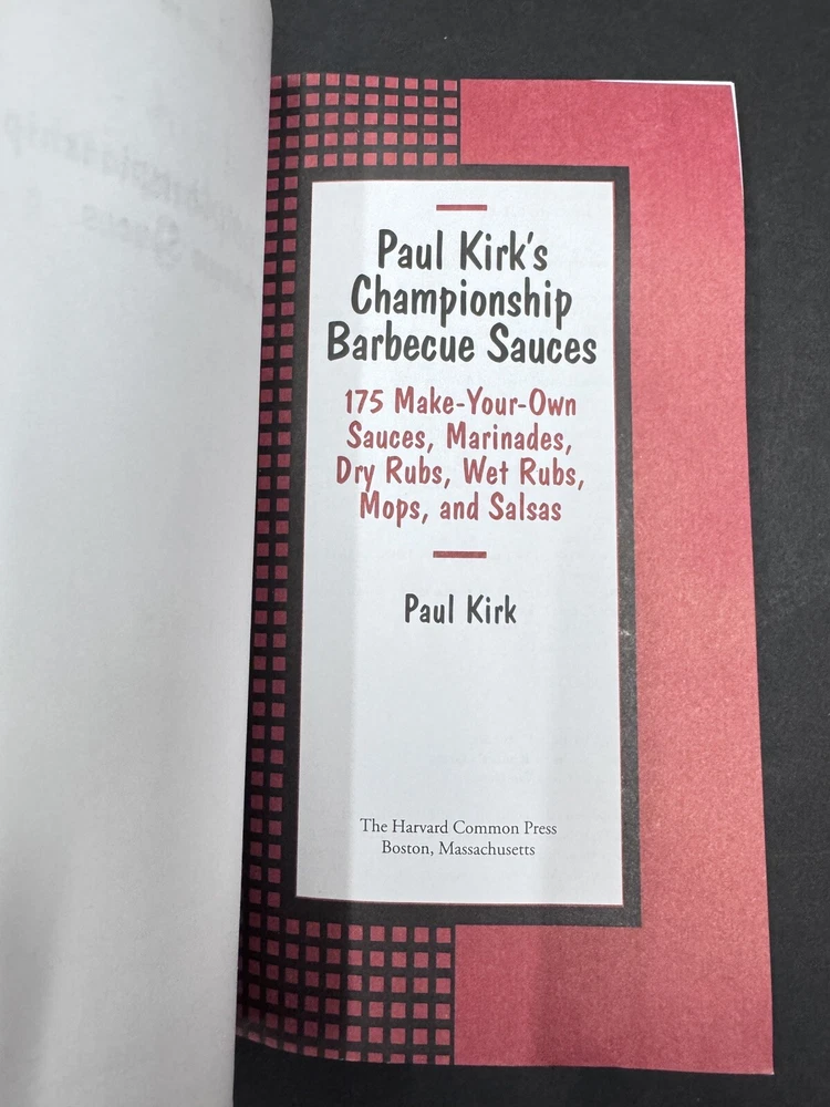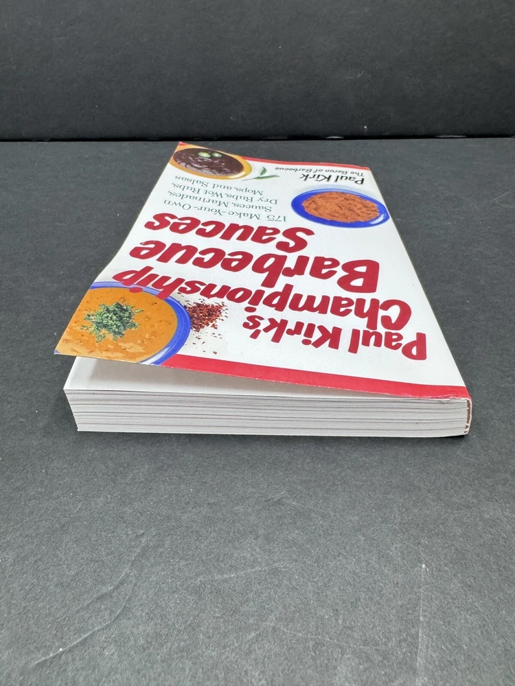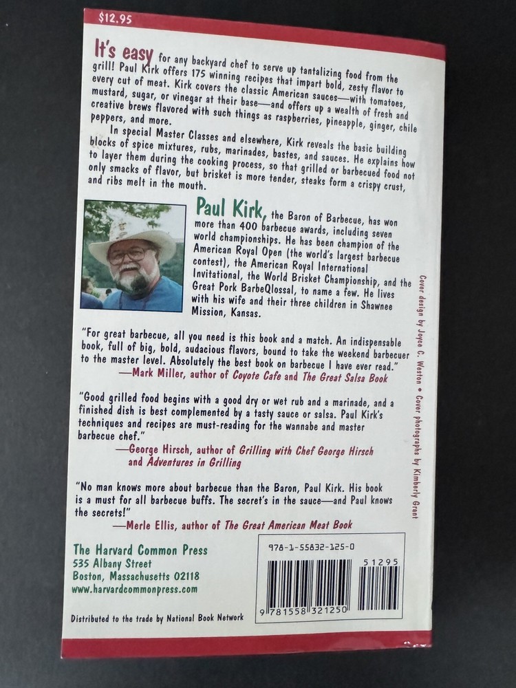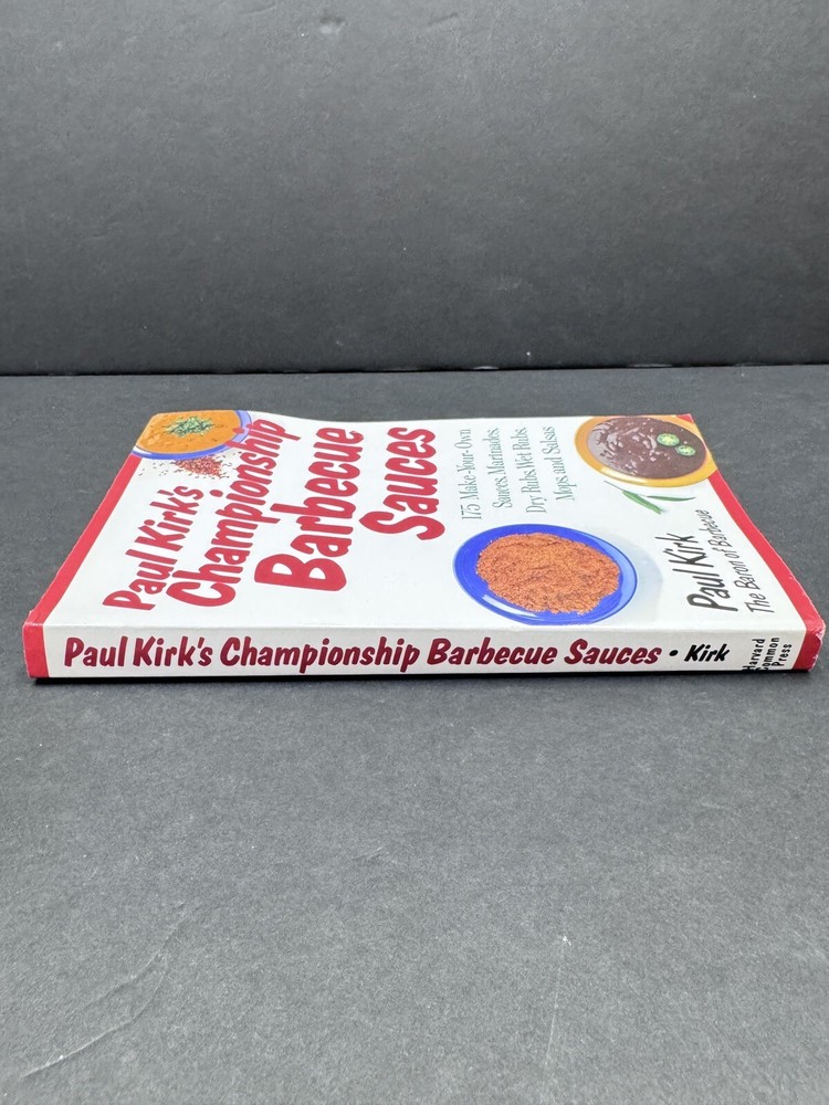 The product is a cookbook titled "Paul Kirk's Championship Barbecue Sauces: 175 Make Your Own Sauces Cookbook" from the book series by Paul Kirk. It features 175 recipes for sauces, marinades, rubs, mops, and salsas for barbecue. The book is illustrated and intended for young adults, ages 9-12, and adults. It was published by Harvard Common Press in 1997 as the first edition, with 272 pages in a trade paperback format.
