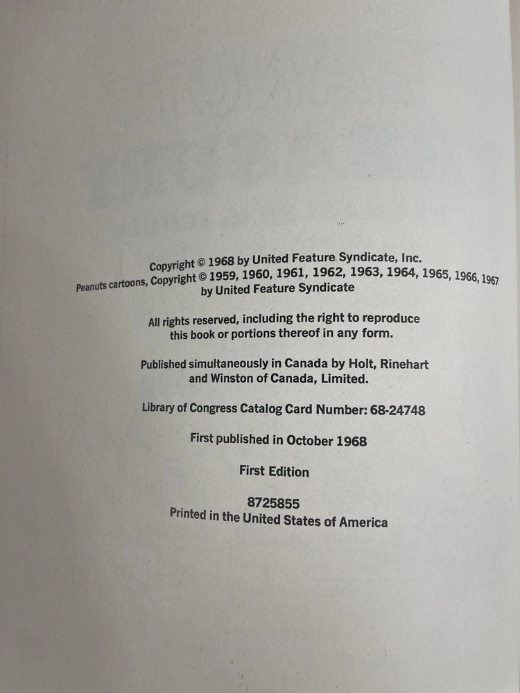 Seller Notes:“Good overall, Some wear to cover, sticker remnant inside cover, See photos”Publisher:Holt, Rinehart and WinstonPlace of Publication:United StatesSubject:ComicsPersonalized:YesAuthor:Charles M. SchulzYear Printed:1968Country of Origin:United StatesBinding:HardcoverOriginal/Facsimile:OriginalIllustrator:Charles Schulzgtin13:Does not applySpecial Attributes:1st EditionCharacter Family:PeanutsLanguage:EnglishISBN:Does not applyTopic:ComicsRegion:North America