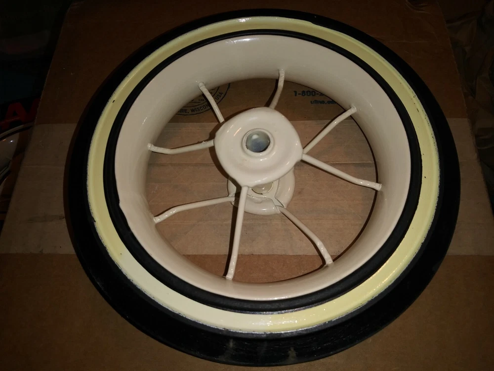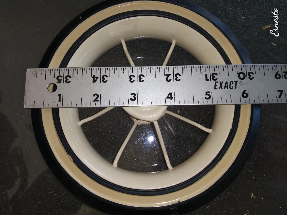 4 hard to find wire wheels. Looks good on custom built pedal cars. This set includes 4 white wall tires and wire rims. You can paint, chrome, gold plate, engrave these rims to add xtra Bling to your pedal car project. Wheels with tires are 6 1/2" wide. Comes with the Red end caps. Tires are white walls. Instructions included on how to remove and replace tires from rims. Custom pedal car NOT included. Shipping to the lower 48 states Look at my other custom Lowrider parts for sale.