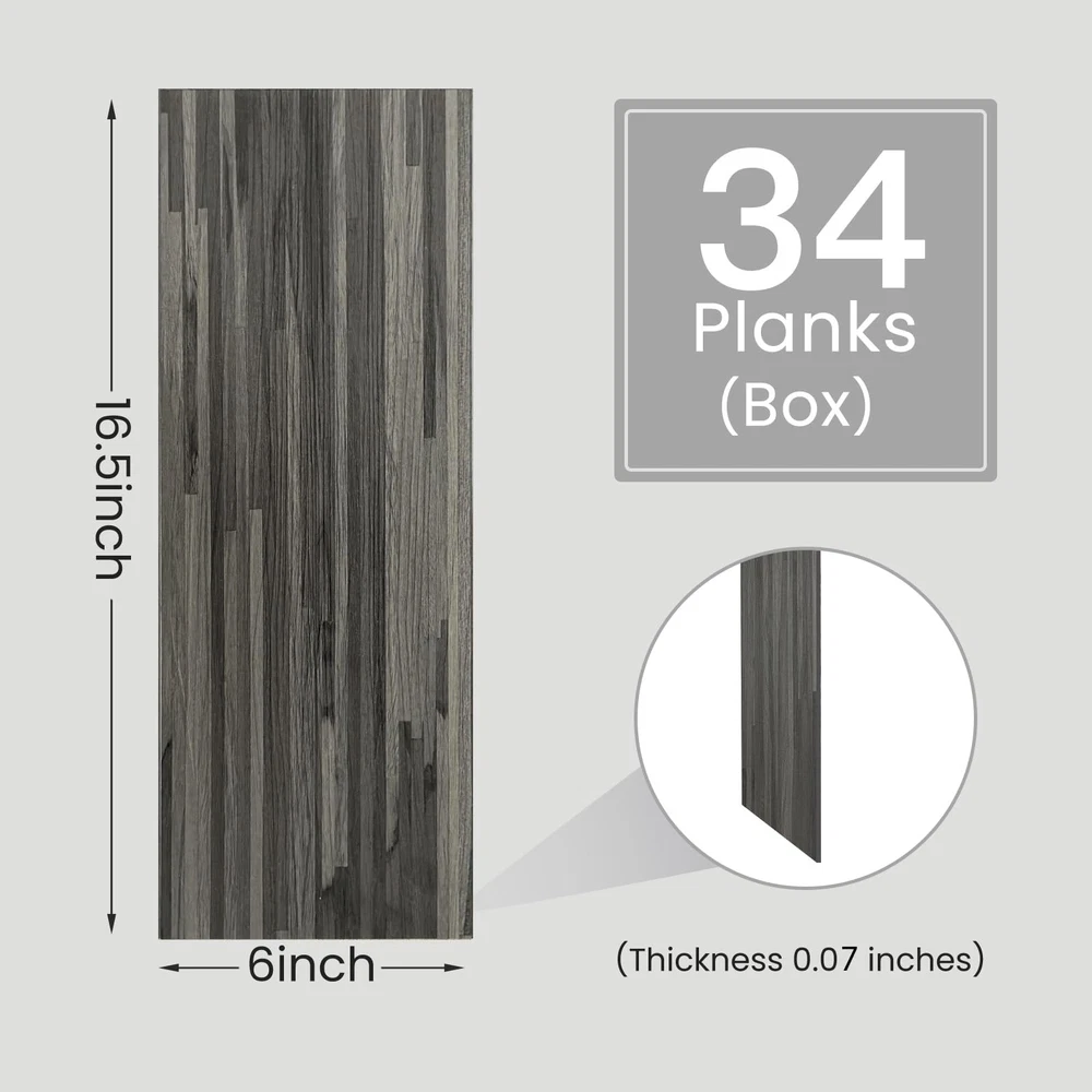 Why choose us? Powerful Feature - Strong self-adhesive and UV treatment make our PVC floor durable, good quality and longer service life. Also they are 100% waterproof, easy cleaning, stain & wear & scratch resistant, non-toxic and fire prevention. Easy DIY - Just peel and stick, on a flat floor or wall for installation, no tools, no experience, no glue. Everyone can do it. Dimention: Plank dimension: 6" width x 16.5" length x 0.07"thickness, pack of 34 pcs, covers 23.5 Sq.Ft. Made of high quality vinyl, durable, textured finish, low gloss, authentic wood look and feel. 100% Waterproof and Self-adhesive: peel and stick vinyl flooring planks use strong adhesive, which can hold the planks to flat ground firmly. Tiles are 100% waterproof with an IXPE integrated sound reduction underlayment that does not absorb water. Peel and Stick: Our vinyl flooring is easy to install, simply peel and stick the tiles to a flat and dry surface to give your home a brand-new look. Stylish: These vinyl floor tiles have the look and feel of natural wood grain. flooring tiles come in many natural wood-look colors so you’re sure to find the perfect match for any space. Application: Peel and stick floor tile for bathroom, bedroom, living room, kitchen, dining room, laundry room, basement, garage, RV floor, home decor, office, can be installed over most subfloor including concrete, vinyl laminate, plywood, ceramic tile