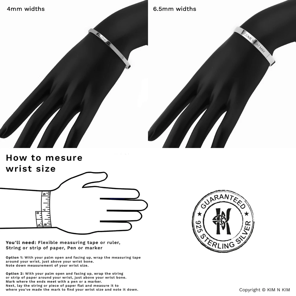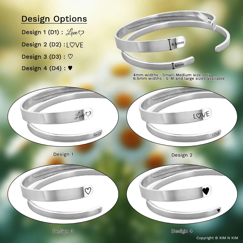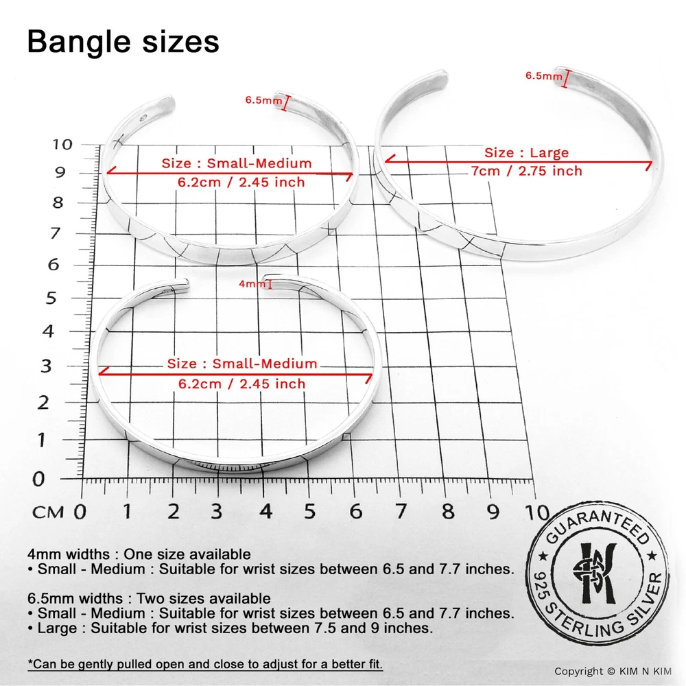 Personalised Bracelet Women✔️Love bracelet ✔️Womens bracelet✔️Heart bracelet This product data sheet is originally written in English. Kim n Kim Jewellery are suppliers of quality handcrafted 925 sterling silver jewellery. Our unique collection is an exciting blend of handmade classic, contemporary and designer silver jewellery at competitive prices. Since its launch in 2002, the site has grown into UK's online jewellery retailers Personalised 925 Sterling Silver Love Bangle Bracelet (Solid Inside) - Small-Medium & Large sizes available 🎁 Kim n Kim Gift Packaging Available - Click Here 🎁 Make it personal with Free Engraving on one side - Maximum 15 characters (including spaces) Please leave a note in checkout stating what character you would like. Please include any capital letters where you would like them as the text will be copied exactly as it has been provided. Please note that the more letters added may result in the text to decrease in size. **Customised bangle or bracelets cannot be returned unless faulty. Please ensure that the item is correct to your needs. Lifestyle Jewellery for men or women Plain Silver, Solid Quality Silver Jewellery Handmade Trendy design Made to Order PRODUCT INFO Brand or Name: Small-Medium Personalised 925 Sterling Silver Love Bangle Bracelet (Solid inside) Product Type : Bangle Gender : Women, Girls Metal : Silver Material Type : 925 Sterling Silver Gem Type : No Stone Length : 165mm / 6.5inch Diameter : 62mm by 55mm (Can be gently pulled open and closed to adjust for a better fit - Fits from 6.5" to 7.7" wrists.) Ball Diameter : 9mm / The ball design is a thick-walled hollow that is built to be strong, but silver (softer metals) can dent or crack under heavy impact. Thickness : 2mm / Solid Width : 4mm /6mm Weight : 12g ~13g / 13~14g Colour : Plain Silver Model Number : KIMBG0226SP Packaging : Official KimnKim Packaging Warranty : 30 days KimnKim Warranty Brand or Name: Large Personalised 925 Sterling Silver Love Bangle Bracelet (Solid inside) Product Type : Bangle Gender : Women, Girls Metal : Silver Material Type : 925 Sterling Silver Gem Type : No Stone Length : 180mm / 7inch Diameter : 70mm by 55mm (Can be gently pulled open and closed to adjust for a better fit - Fits from 7.5" to 9" wrists.) Ball Diameter : 9mm / The ball design is a thick-walled hollow that is built to be strong, but silver (softer metals) can dent or crack under heavy impact. Thickness : 2mm / Solid ID Width : 6.5mm Weight : 19g ~20g Colour : Plain Silver Model Number : KIMBG0219SP Packaging : Official KimnKim Packaging Warranty : 30 days KimnKim Warranty **All size and weight are approximate** BUY WITH CONFIDENCE - Authorised stockists of every brand on our store - Full manufacturer's guarantee - 19 Years in the Jewellery Retail - Before sending items are thoroughly checked, and further checked and photographed. - As a Store. All enquiries will be answered Monday-Saturday 10am-5pm. - All weights and measurements are approximate and may vary from the listed information. - Same day dispatch on all orders placed before 4pm on Mon-Fri. - All delivery time frames exclude Bank Holidays. - During busy sale or seasonal periods, there may be delays on processing orders. We recommend that you order ahead of time to avoid disappointment. - All orders shipped from the UK - Secure online credit card processing RETURN & EXCHANGE - Cancelling Your Order: You have 2 hours from ordering your item to cancel it. After that time we cannot guarantee that your order can be cancelled as it may already have begun production. If that is the case your order will be sent to you and a refund will not be provided. - Returns & Exchanges Policy: We are confident that you will be happy with your purchase but in the unfortunate event that you are not, we will do our very best to make it right. If the item you have ordered is defective, or you have simply changed your mind then, provided that it is in its original condition and not personalised(non-engraved), you can return it to us for prompt replacement or refund within 14 days of delivery. - Bespoke or Personalised Products: Unless there has been an error on our part, or the item you have purchased is defective or damaged, we cannot accept returns on 'personalised', 'bespoke' items or Pierced Products (such as earrings and body jewellery) It is vitally important that when you place your order for personalised products(Engraving) that you check all details, including dates, spelling, punctuation and grammar are correct and we will not be checked them. Certain items are excluded from the cooling off period guarantee, Unless there has been an error on our part, or the item you have purchased is defective or damaged, we cannot accept returns on 'personalised', 'bespoke' items or Pierced Products (such as earrings and body jewellery) We offer a full refund on goods that are returned to us within 14 days of dispatch. The goods must be returned unused, and in their original packaging. Please notify us by Our ebay support team . With your return, so that we can process your return as quickly as possible. If you wish to return an item; please use the return address stated on our address, and ensure that you pay the correct postage for the size and weight of the goods. We cannot accept responsibility for parcels returned to us that are lost in transit; therefore we strongly recommend at least the royal mail signed for service. The original delivery charge, if one was applied, will be refunded at the same time as the returned goods. Once we have assessed the items, We aim to do this within 14 working days of the receipt of the goods, and will notify you by email once this has been done. This returns policy does not affect your statutory rights. The Best Ways to Take Care of Sterling Silver Jewellery Reactions to sterling silver jewellery Some people may experience a blackening of the skin while wearing sterling silver jewellery. This may be caused by