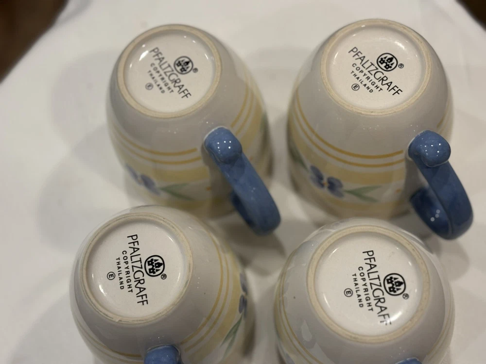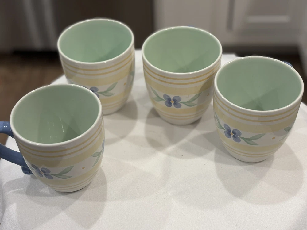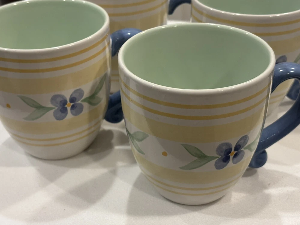 The "Summer Breeze" Pfaltzgraff Mugs Set features a vintage Four-Piece collection of round mugs with a capacity of 14-16 oz. each. Manufactured in 1990, the mugs are decorated with a colorful floral pattern of blue flowers and yellow plaid trellis, adding a touch of summer charm. These contemporary-style mugs are microwave and dishwasher safe, making them convenient for everyday use. Crafted from stoneware with a glossy finish, these mugs are a delightful addition to any table setting for all occasions. Return accepted within 30 days; buyer pays return shipping Thank you for your consideration