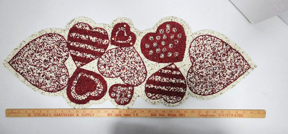Pier on Valentin heart beaded table runner. 13 inches by 36 inches, New without tags. One owner and I never used it. all beads present. excellent condition Please scan, enlarge and review all photos closely for they are a large part of the description. Photos are of the actual item offered for sale. Communication: Please contact me if you have any questions prior to purchase. I will email you as soon as your item is shipped. Payment : please pay immediately. Items are not kept on hold for extended periods. Shipping and handling: I will ship your order within one business day whenever possible. Please verify your address during checkout. I am not responsible for any wrong or undeliverable addresses. Combined Shipping is offered. I offer free returns within 30 days , if item doesn't match the description. Returns must be initiated within 7 days after delivery. Item must come back in the same condition and like packaging as it was sent to you for a refund. Please check out my other items.