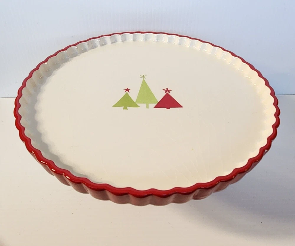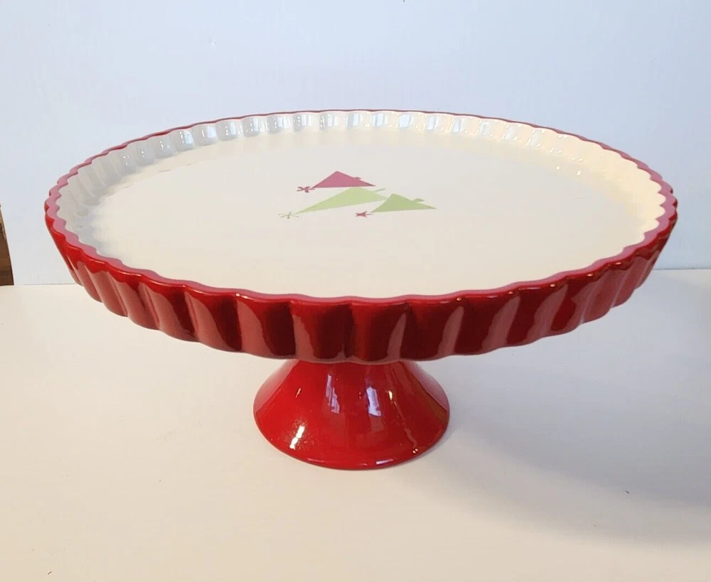 Pier 1 Ceramic Christmas Trees Pedestal Cake Pie Stand Hand Painted Ironstone Measuring 11" round x 5 1/2" tall. In good preowned condition with two tiny white spots along the red edge as shown in photos and a slight crazing on top white space. Please see all the ENLARGED PHOTOS for more details. Will be packaged well for a safe delivery!