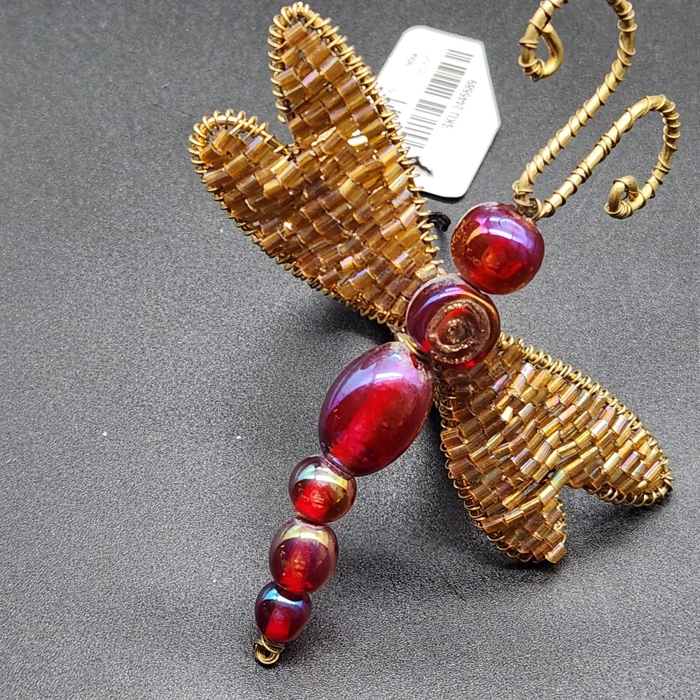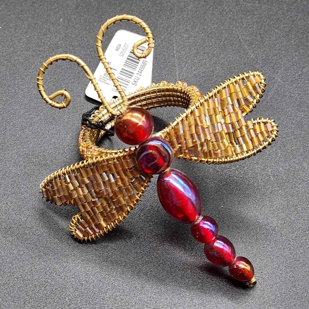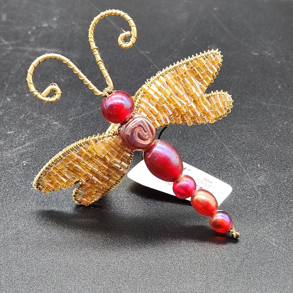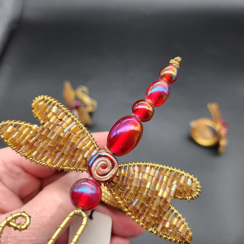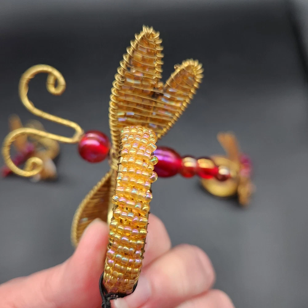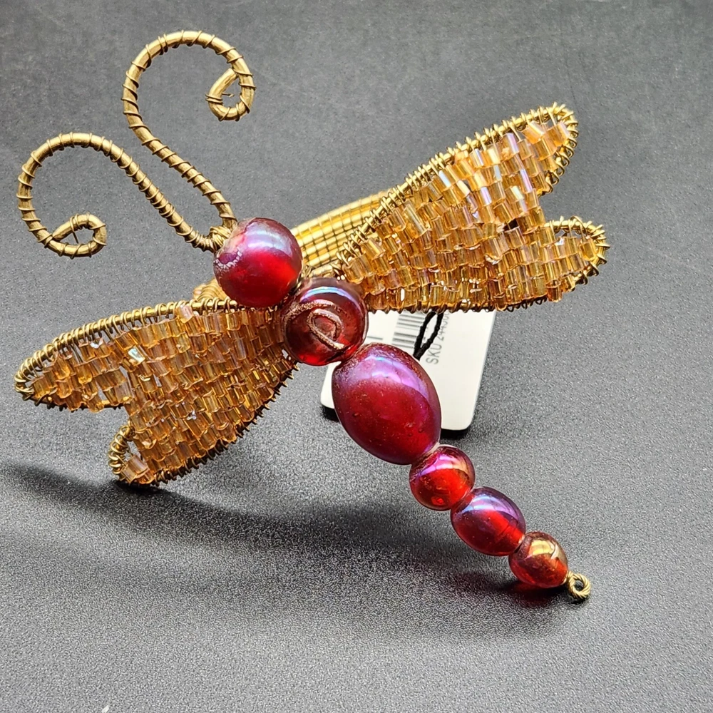 These napkin rings are like dragonflies with a serious bling addiction. They'll hold your napkins tighter than a dragonfly holds onto summer. Perfect for adding a buzzing flair to your dining table. • Intricate beaded design • Vibrant red and gold colors • Metal wire construction • Set of 6 dragonflies • Each measures approximately 3.75" long. Pre-owned but in very good condition. Original tags still attached. See photos for details.