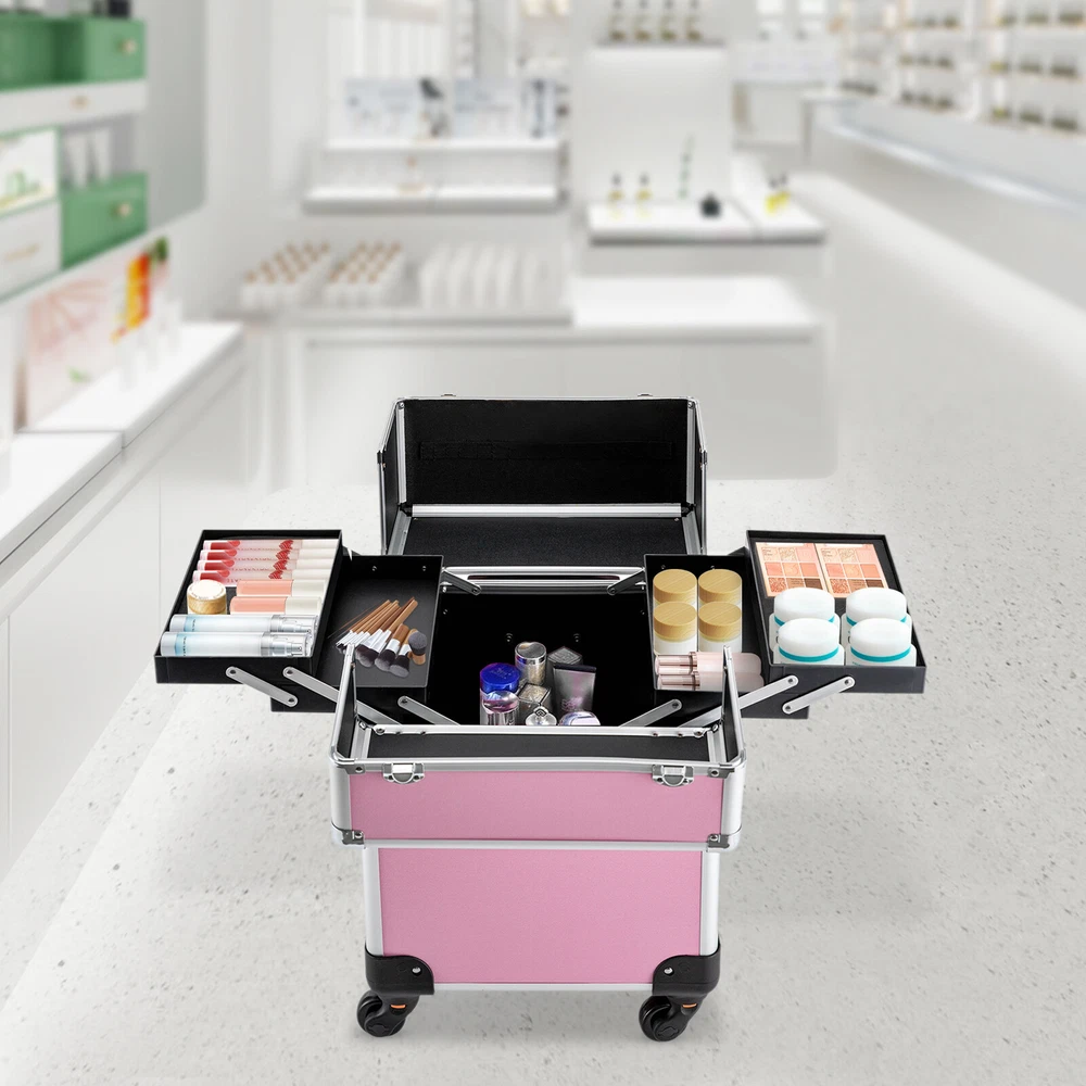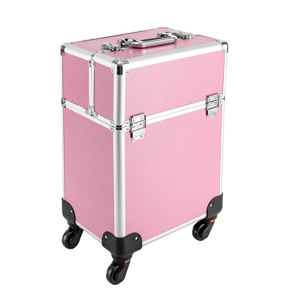 This pink rolling train case is a game-changer for makeup artists and beauty lovers! The sturdy aluminum alloy and ABS construction keeps everything secure, while the four spacious trays neatly organize all my cosmetics. The smooth universal wheels and retractable handle make it effortless to roll around, even fully loaded. The frosted finish gives it a sleek, professional look, and the latch opening ensures quick access. Perfect for travel or salon use—highly recommend for anyone who needs a durable, stylish, and ultra-functional cosmetic organizer!