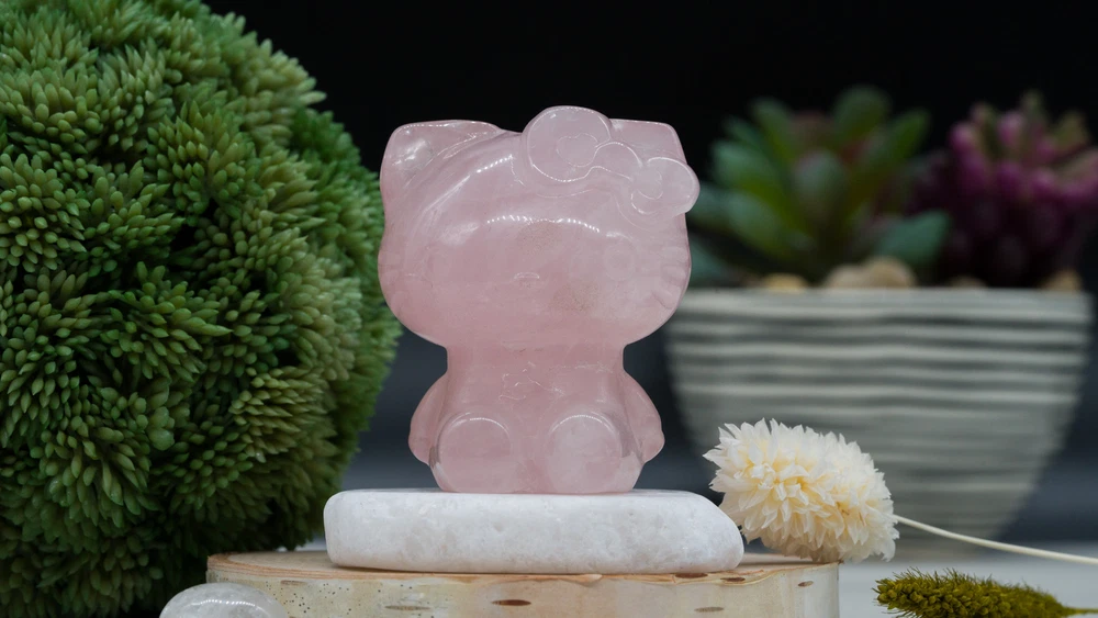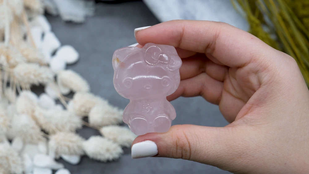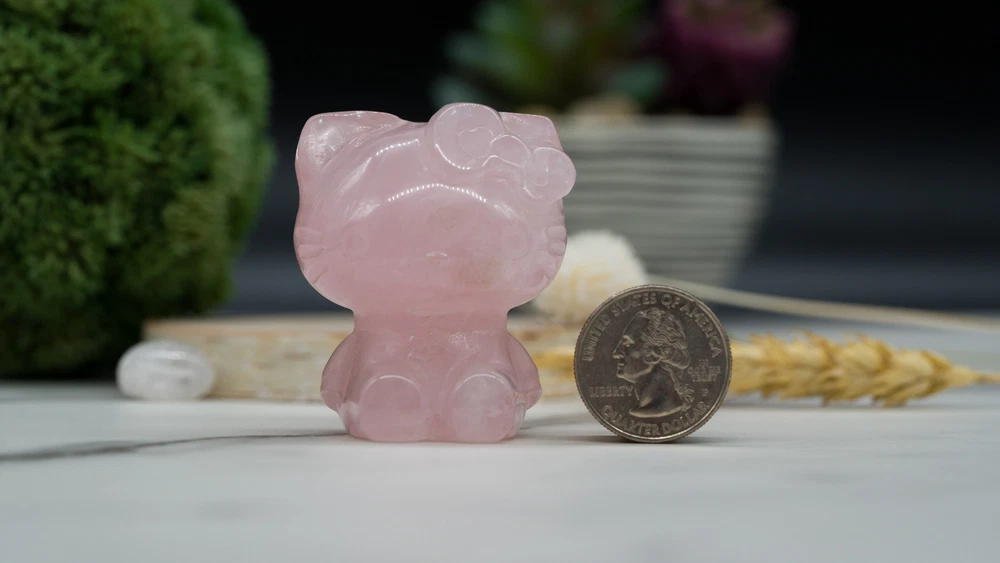 This cute Hello Kitty carving is made from natural pink rose quartz crystal and makes a great gift for yourself or a loved one! You will receive one (1) intuitively chosen crystal carving measuring approximately 2". Example photo has been provided for approximate size reference. Rose Quartz is associated with the heart chakra and is said to restore trust and encourage love, emotional healing and growth, and compassion. It is a macro-crystalline mineral: this means that crystals can be harvested as large intricate raw crystals. Like all Quartzes, Rose Quartz is a compound of SiO2. Given that, it is identified from other Quartzes both scientifically by its microstructure and by its color. Gems and crystals are great for altars, grids, terrariums, pocket stones, gifts, home decorating, jewelry, collecting and more! They are also wonderful additions to meditation, spiritual, and chakra work. *This listing uses professional photography to provide samples of our collection of products. Each stone is natural, unique and beautiful so please expect slight variations in color, texture, and size. You will receive a product similar to that of the picture, but not the exact product. **Please note that healing crystals are not a replacement for traditional medical treatment and are not meant to replace consulting with a medical professional and do not guarantee any medical cure for any condition. ***This is not an officially licensed Sanrio product, and only features the likeness of the character Hello Kitty on a fanart basis.