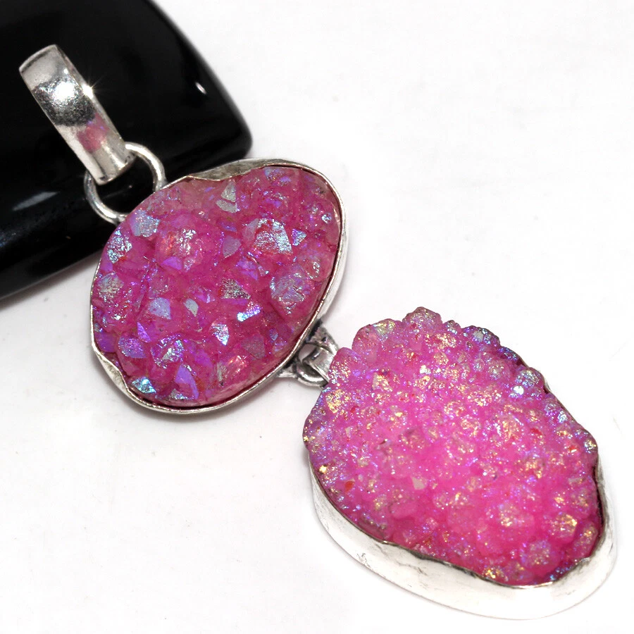 Pink Titanium Druzy 925 Silver Plated Long Pendant 2.5" Gifts For Women JW