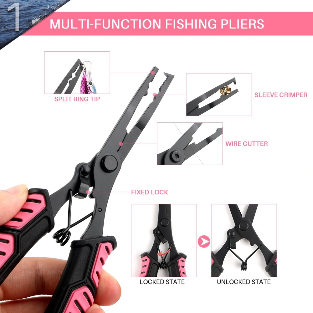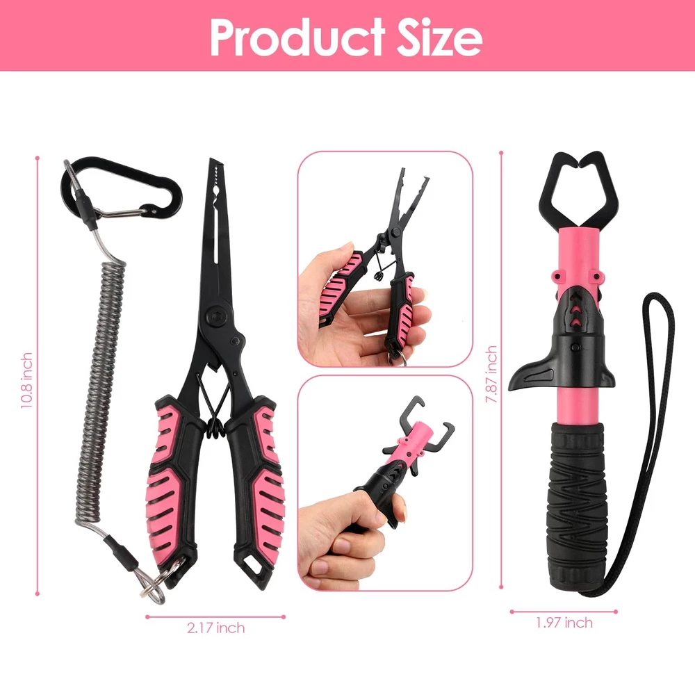 Fishing Pliers Fish Lip Gripper Fishing Tool Kit Muti-Function Saltwater Fishing Line Cutter Hook Remover with Sheath Lanyard, Fly Ice Fishing Gear Fishing Gifts for Men Women (Pink & Black) MULTI-FUNCTION FISHING PLIERS - The needle nose design can be used to effortlessly deep to reach into toothy fish, can be used as hook remover, press and crimp, split rings, line cutter, tying knots and adjusting lures, etc SALTWATER FISHING PLIERS - The 7-inch fishing pliers are made of premium 420 stainless steel coated with a tough corrosion resistant coating, solid and rust-resistant, designed for long term performance, making it an optimal choice for fishing lovers POWERFUL FISH LIP GRIPPER - The thickened two-piece jaws and built-in strong spring lock firmly and seamlessly, wide opening, easy to grip handles and quick release lever, one hand operation to grip, easy to catch the big fish and improve fishing efficiency COMFORTABLE TO GRIP - With ergonomic texture rubber handle, provide a firm hold to grip, non-slip grip design is completely fit hands and no problem at wet situation, a helpful tool for fishermen. Each tool has a rope to hang for storage or to prevent loss while in use PERFECT GIFT FOR ANGLERS - The fishing tackle kit includes fishing pliers with sheath and coiled lanyard, the fish lip gripper with nylon lanyard, perfect for outdoor saltwater and freshwater fishing. Ideal gifts for your friends and family on Father's Day, Mother's Day, Valentine's Day, Christmas Day, or Birthday Muti-Function Fishing Pliers Fish Lip Gripper, Fishing Tools Kit Features Fishing Pliers can be used as hook remover, press and crimp, split rings, line cutter, tying knots and adjusting lures, etc. Fish Lip Gripper with thickened two-piece jaws and built-in strong spring lock firmly and seamlessly With ergonomic texture rubber handle, provide a firm hold to grip when removing hook and split ring One hand operation to grip, easy to catch the big fish Suitable for saltwater and freshwater fishing Suitable for beginners and advanced Specification FISHING PLIERS Material: 420 Stainless steel Color: Pink, Red Length: 7inches/18cm Weight: 3.2oz/91g FISH LIP GRIPPER Material: 304 Stainless steel Color: Pink, Red Length: 7.87inches/20cm Weight: 3.3oz/94g Package Content 1 x Fishing Pliers 1 x Fish Lip Gripper Shipping We offer FREE shipping on all orders! We ship within Three business days of payment, usually sooner. We use a selection of shipping services such as UPS, FedEx, USPS etc. We only ship to the lower 48 states, no APO/FPO addresses or PO Boxes allowed. Local pickups and combined shipping options are not provided at this time. Return You can return a product for up to 30 days from the date you purchased it. Any product you return must be in the same condition you received it and in the original packaging. Please keep the receipt. Payment We accept payment by any of the following methods: PayPal Please pay as soon as possible after winning an auction, as that will allow us to post your item to you sooner! Feedback Customer satisfaction is very important to us. If you have any problem with your order, please contact us and we will do our best to make you satisfied. Contact Us If you have any queries, please contact us via ebay. We usually respond within 24 hours on weekdays. Please visit our eBay store to check out other items for sale! Thank you for shopping at our store.