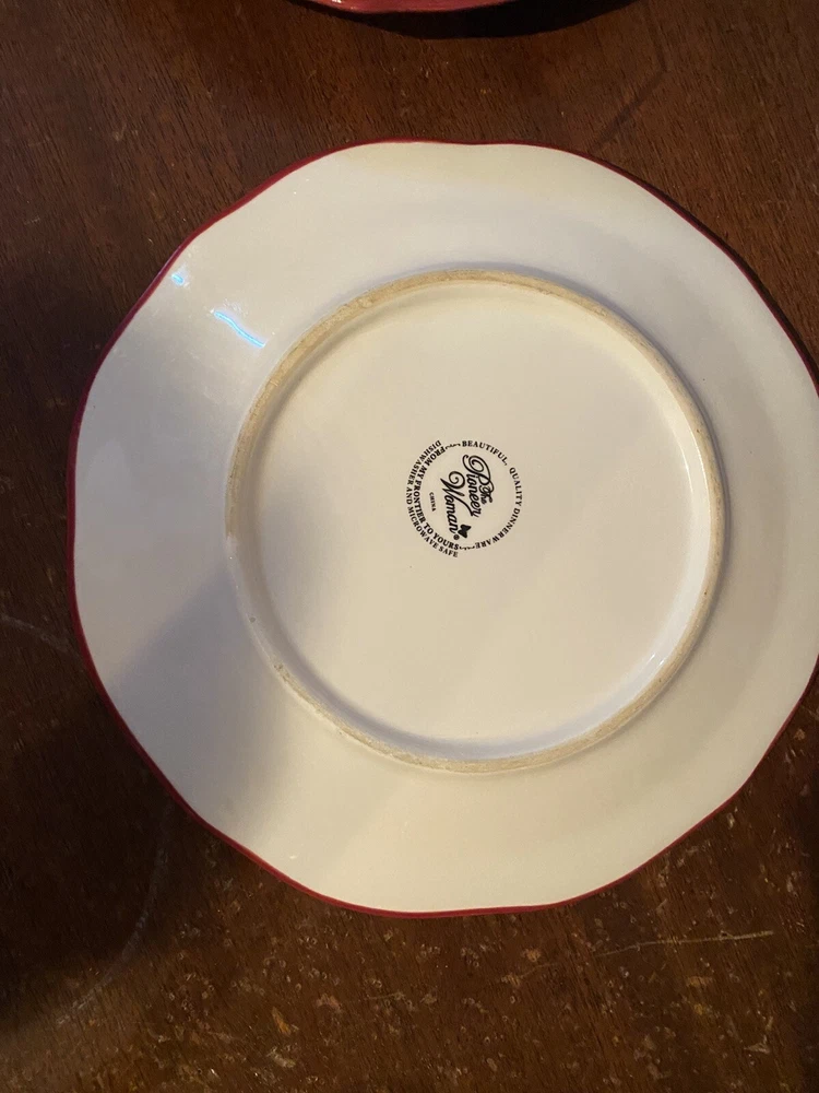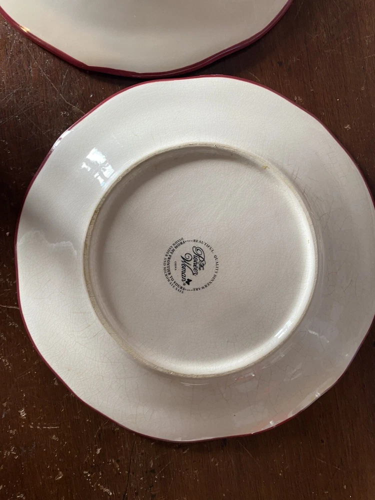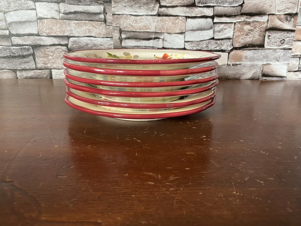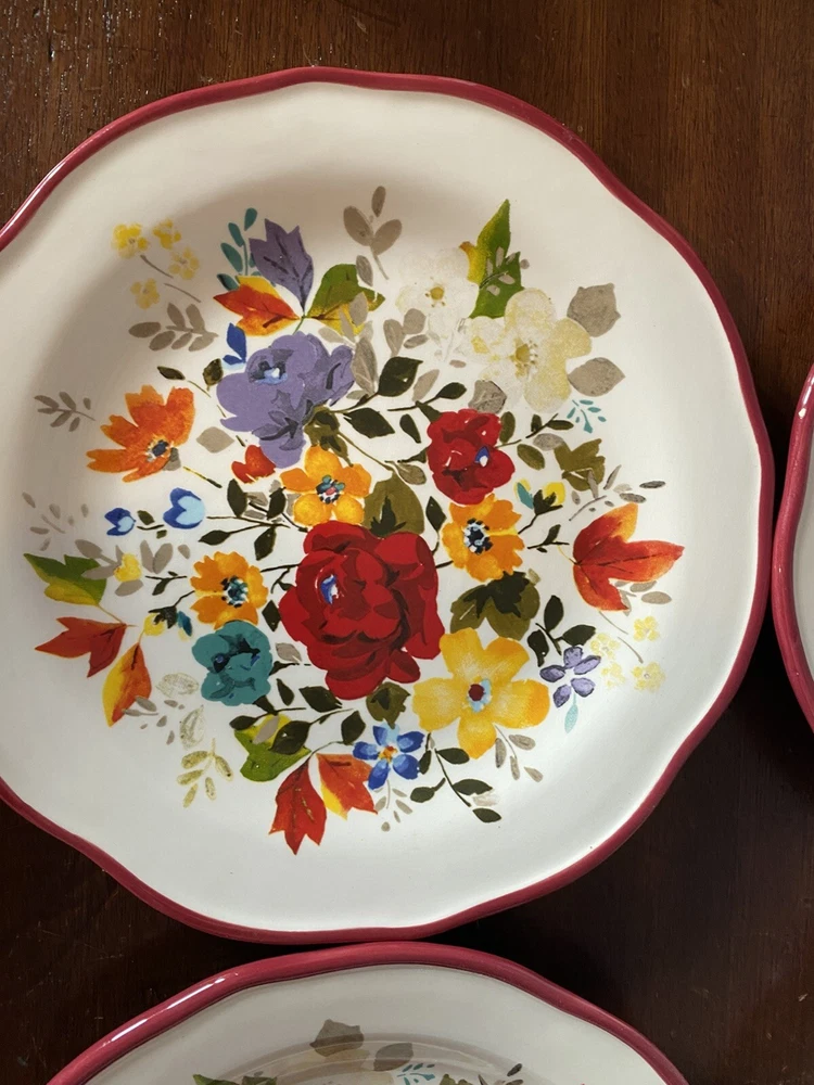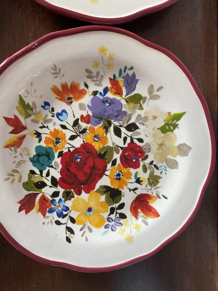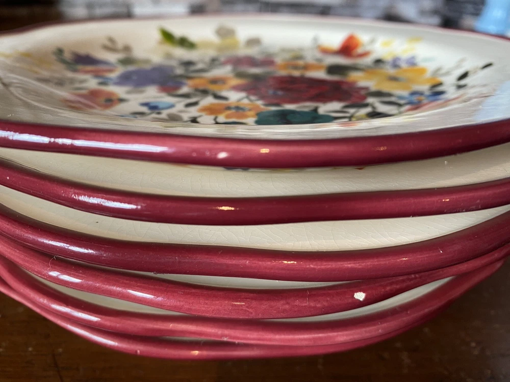 Pioneer woman set of seven red floral luncheon plates. Three of the plates have some crackling on them three do not. There are also 2 small nicks on two of the rims of the plates and one small stain on one. Please see pictures.