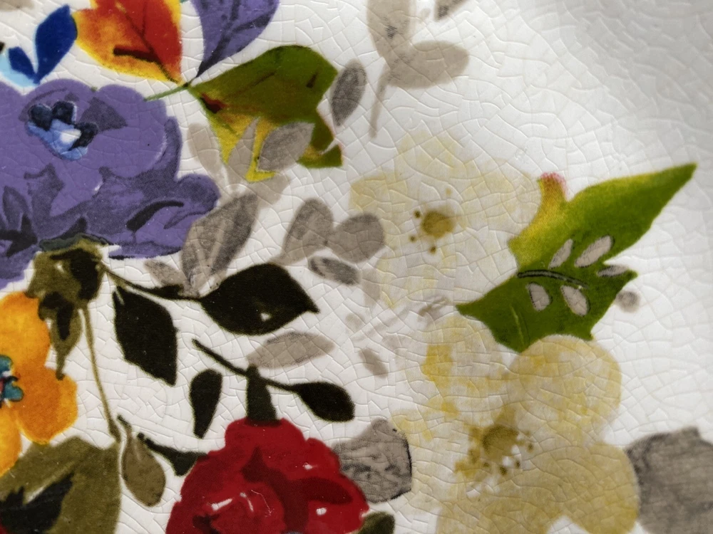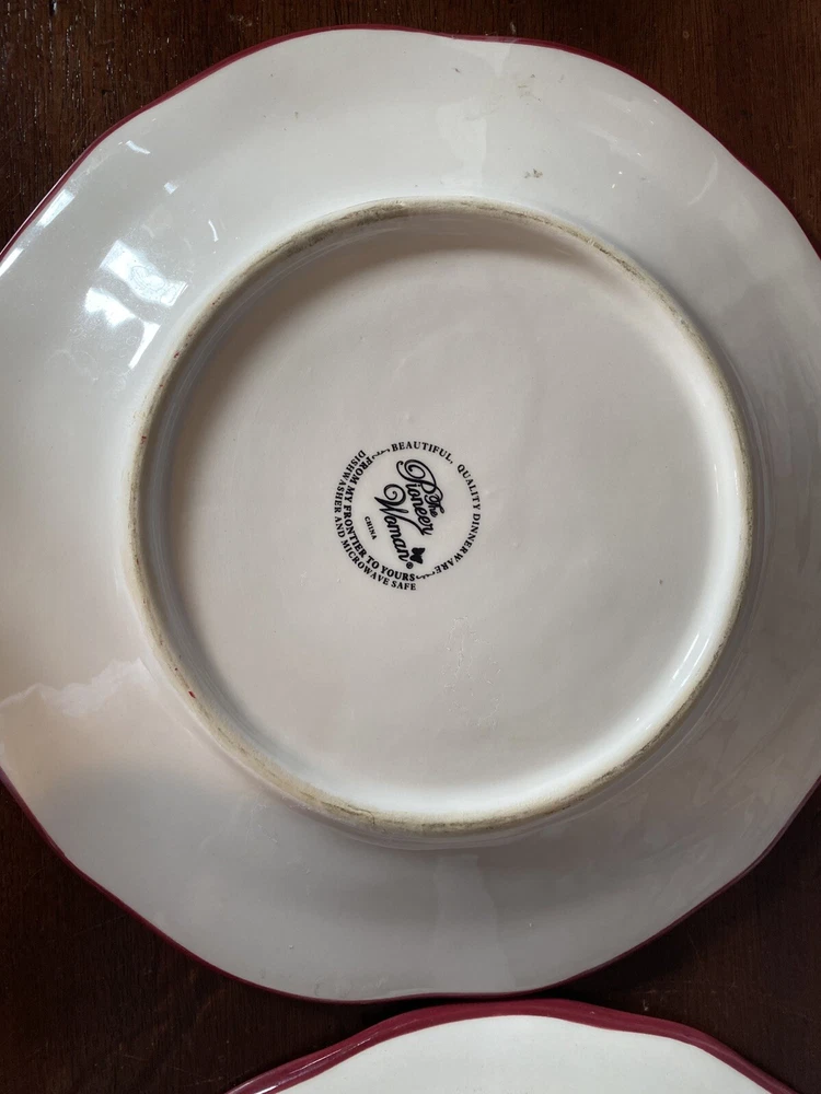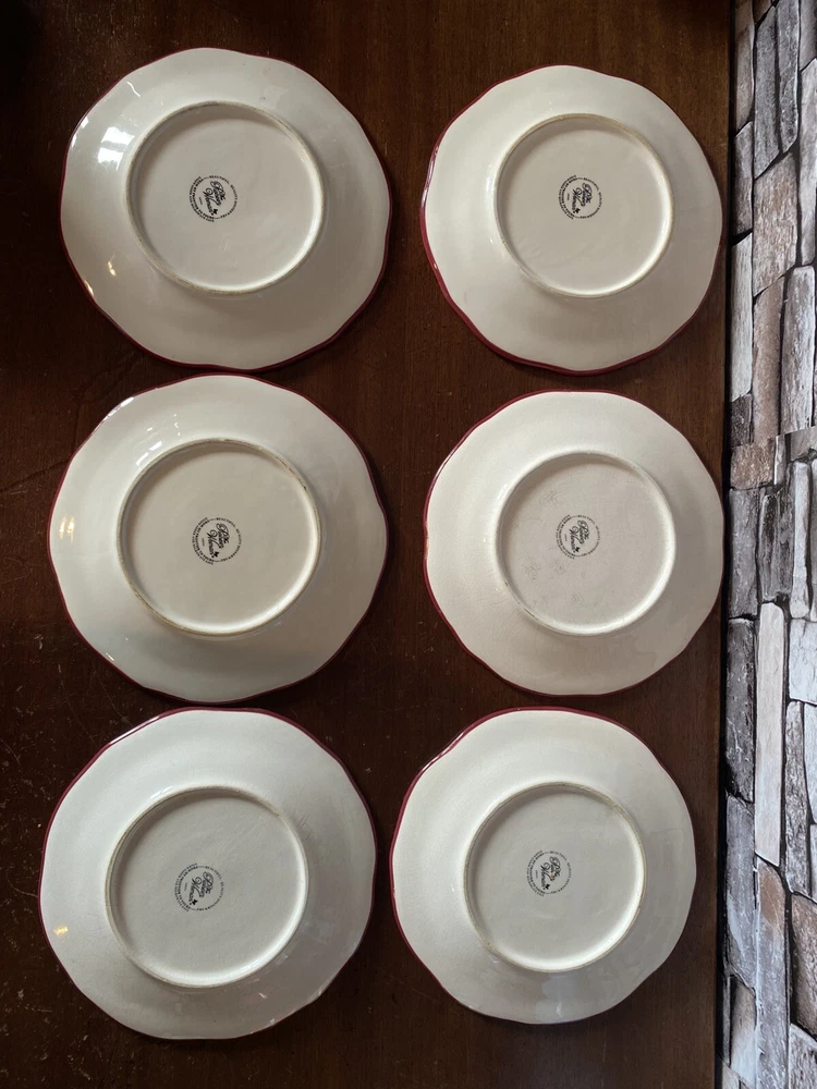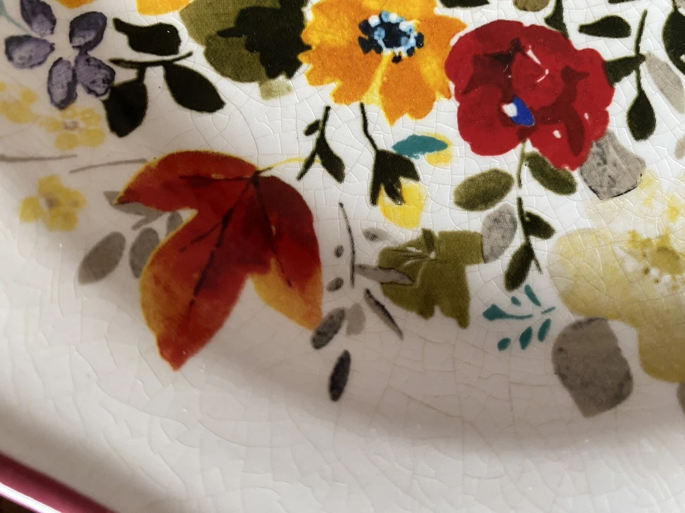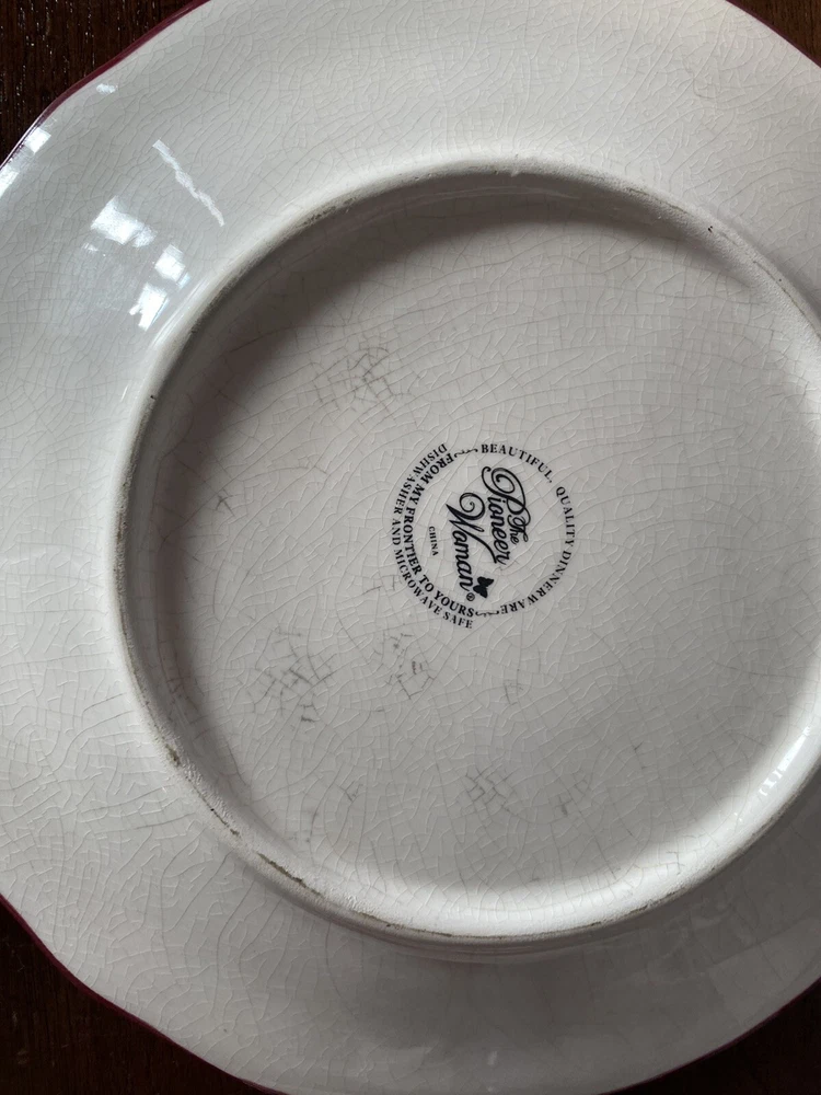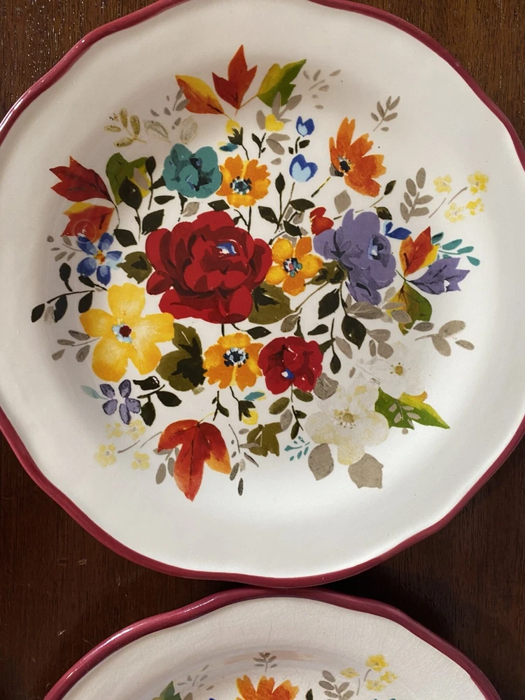 Pioneer woman set of seven red floral luncheon plates. Three of the plates have some crackling on them three do not. There are also 2 small nicks on two of the rims of the plates and one small stain on one. Please see pictures.