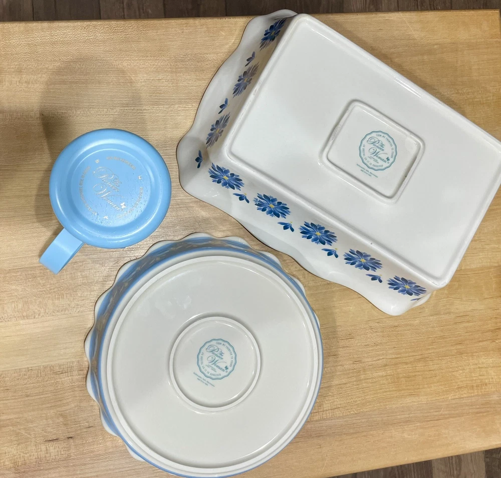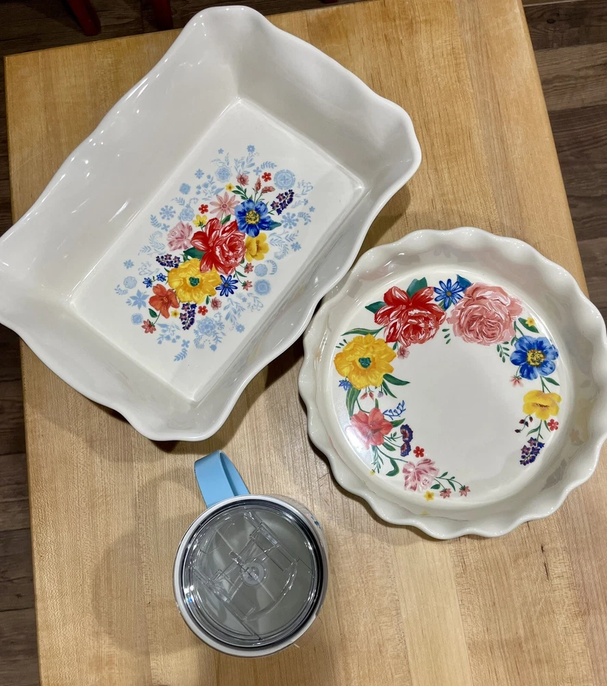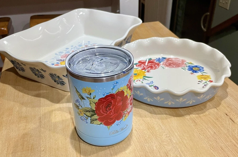 The product is a set of three items from The Pioneer Woman brand. The set includes two metal baking dishes and a tumbler. The baking dishes are suitable for baking and the tumbler is suitable for storing and serving drinks.