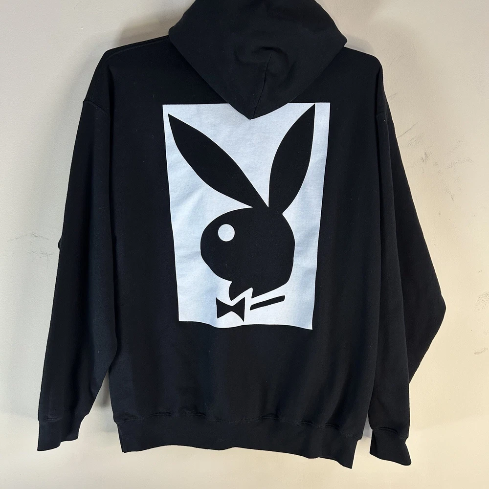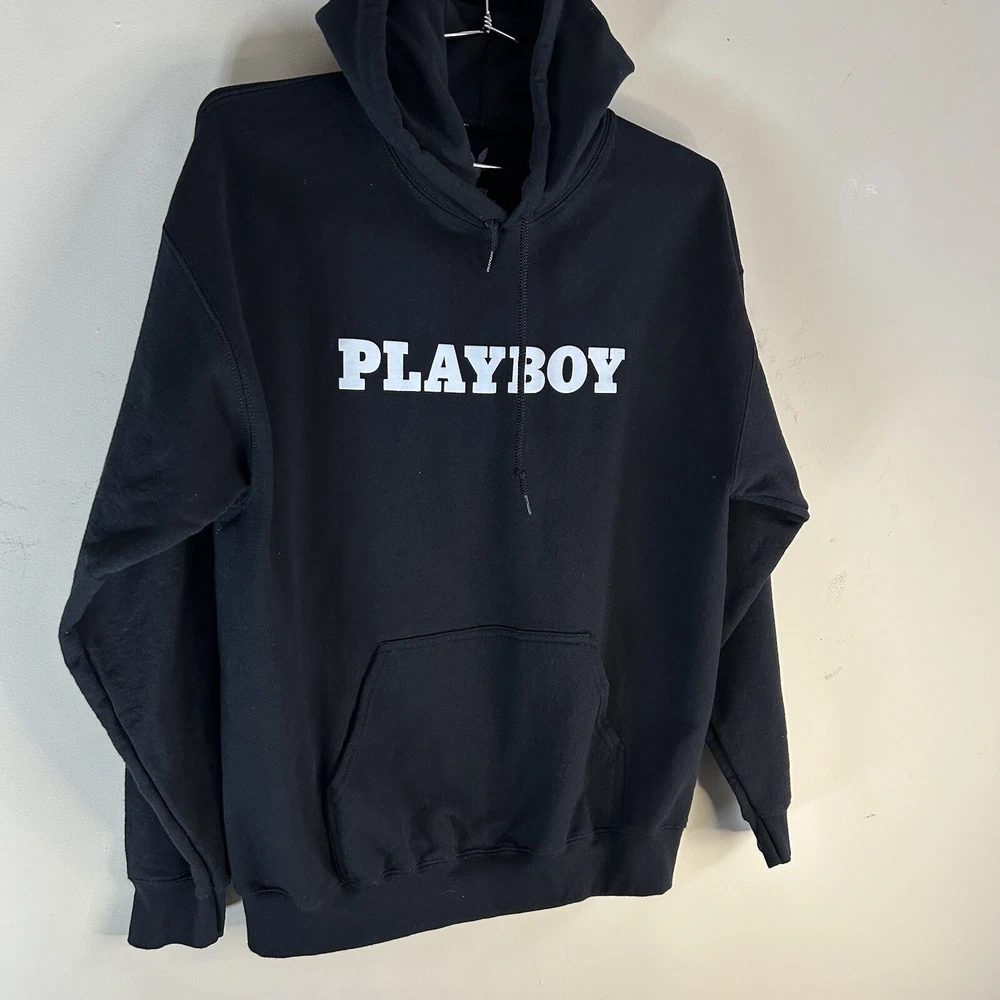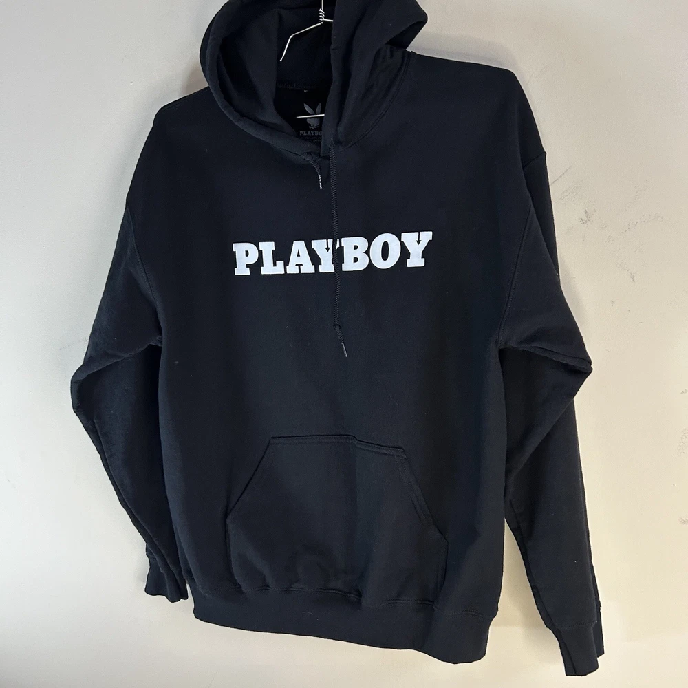 This is a stylish and comfortable Playboy hoodie in black, perfect for activewear or casual wear. It features a drawstring front for an adjustable fit and convenient pockets for storage. The long sleeves are great for cooler weather, and the solid pattern and large Playboy logo add a touch of flair. Made from high-quality cotton and with no signs of wear and tear, this hoodie is perfect for anyone who values both style and comfort. The size L hoodie is designed for women and is a regular fit. The brand is well-known and trusted, ensuring a quality product.