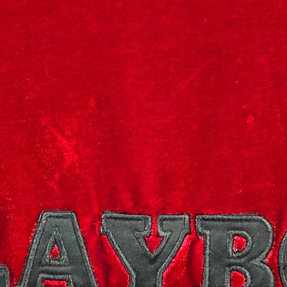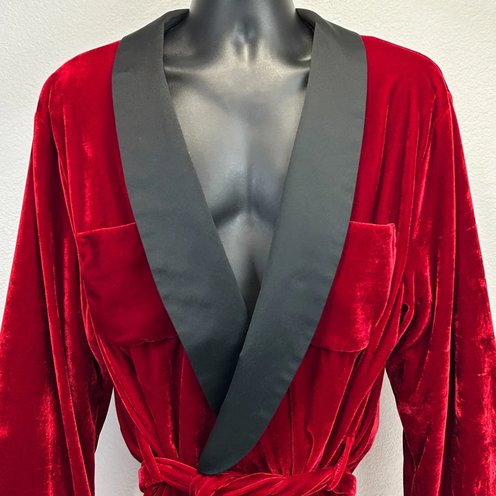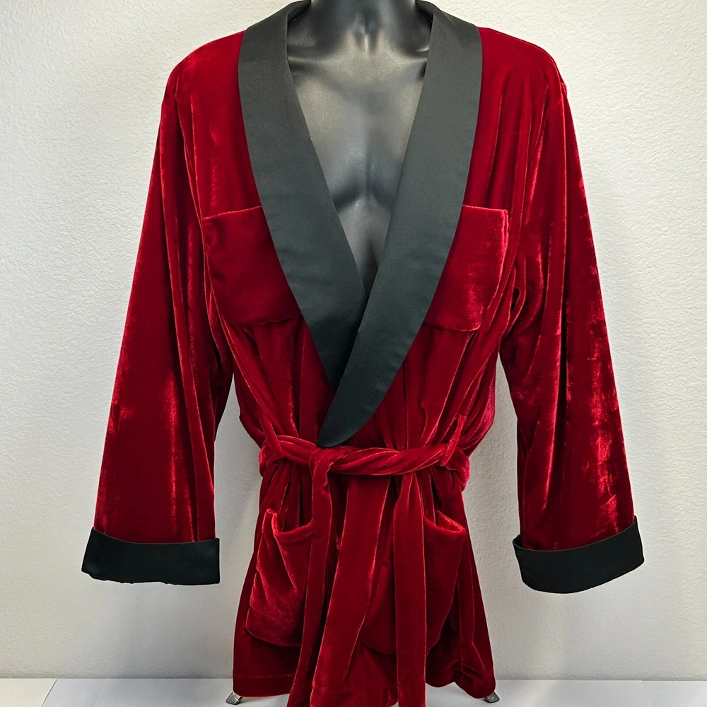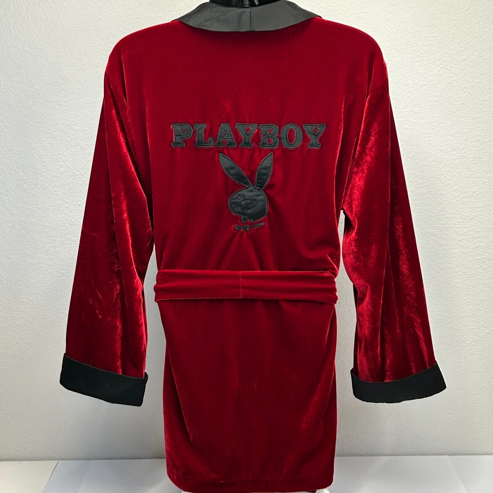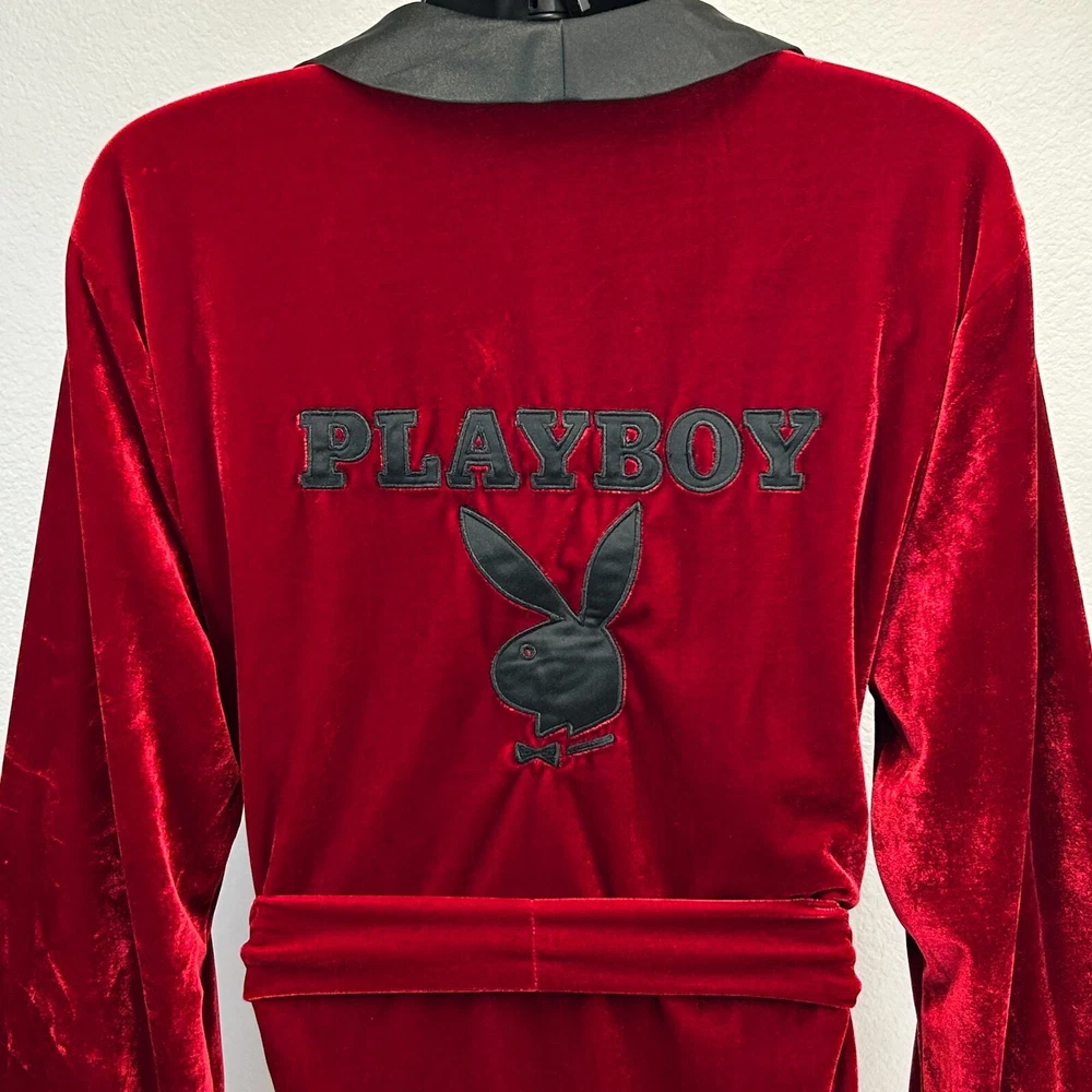 Playboy Smoking Jacket Robe Mens OSFM Velvet Velour Bunny Logo Hugh Hefner Halloween Costume 2007 Officially Licensed Red CONDITION: Has some scratches in the velour - no other flaws noticed. See photos. SIZE AND MEASUREMENTS: Mens/Unisex OSFM Width 25" - Underarm to underarm Length 34" - From the back, measure base of collar to the bottom Sleeve Length 34" - From the center of the back of the neck to the shoulder to the bottom of the sleeve