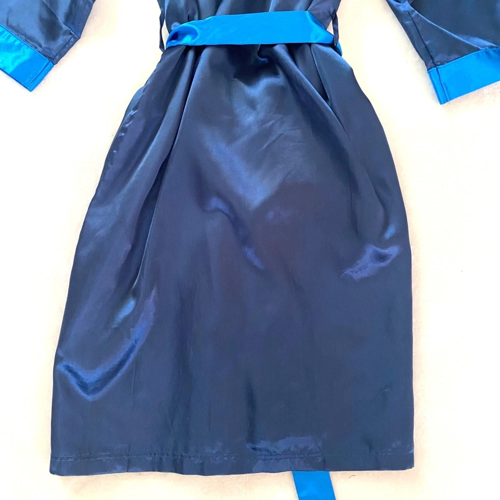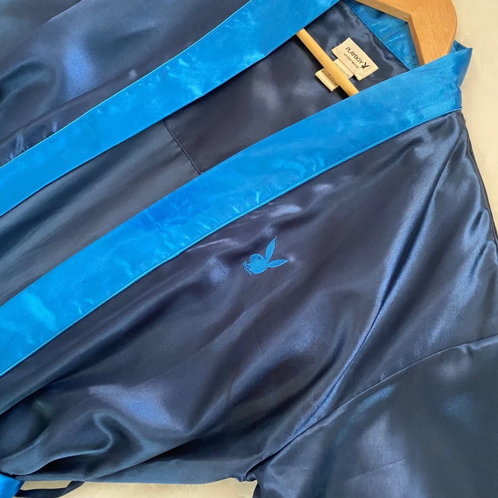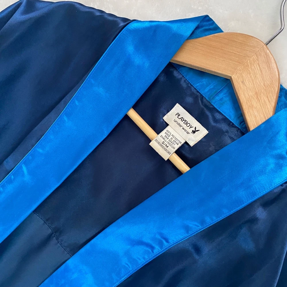 vintage Playboy bunny silky blue robe mens size S/M polyester Looks great overall. On close inspection you can see there are several spots/stains that I've not attempted to treat. No fade, odors, or wash wear. Tie/sash included. playboy, playboy bunny, mens playboy, playboy robe, silky mens robe, mens silky robe, mens robe, robe, polyester robe, blue robe, playboy underwear