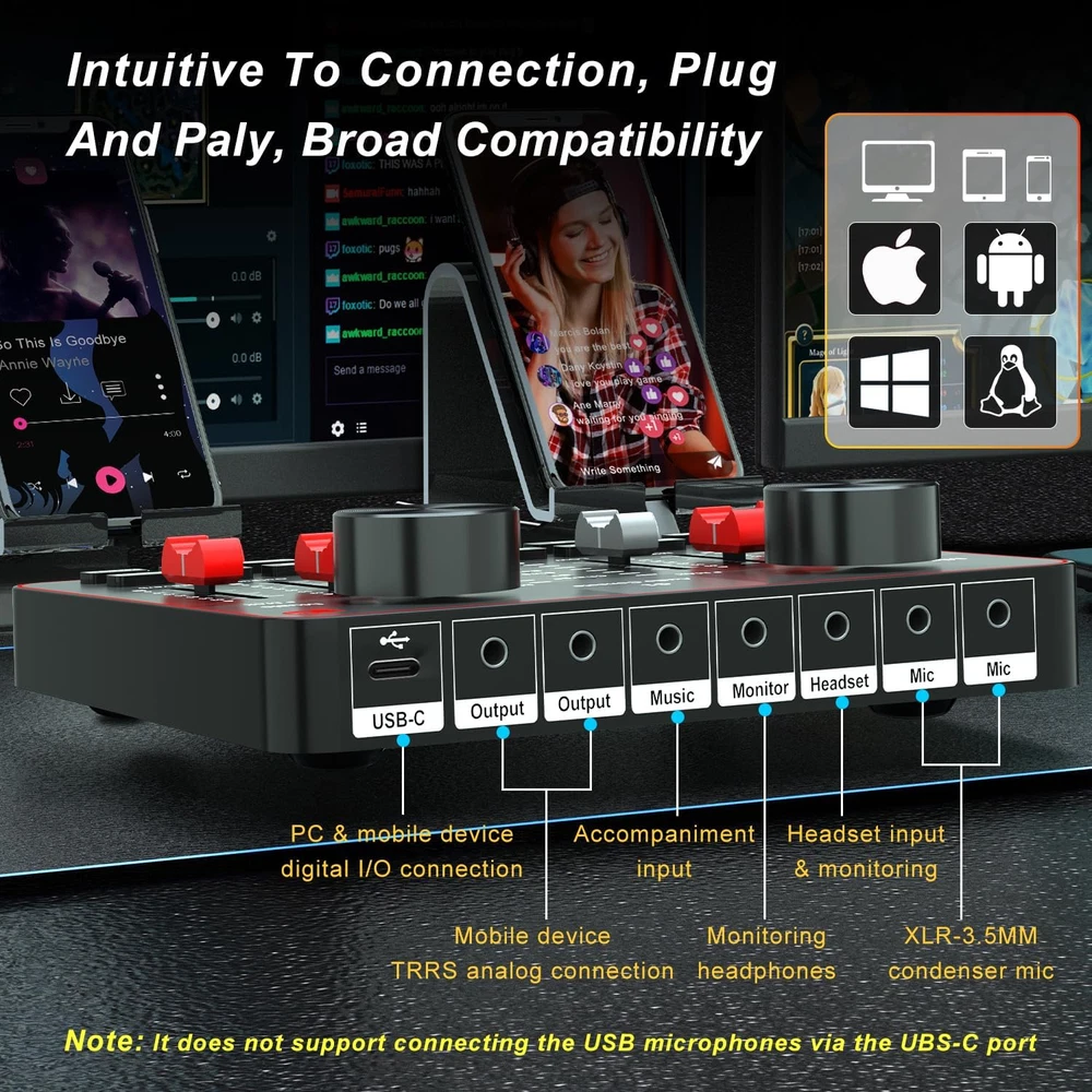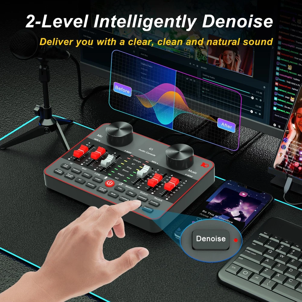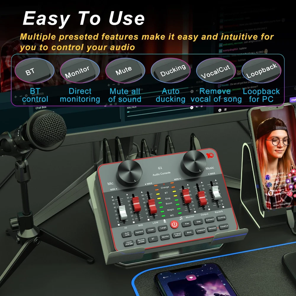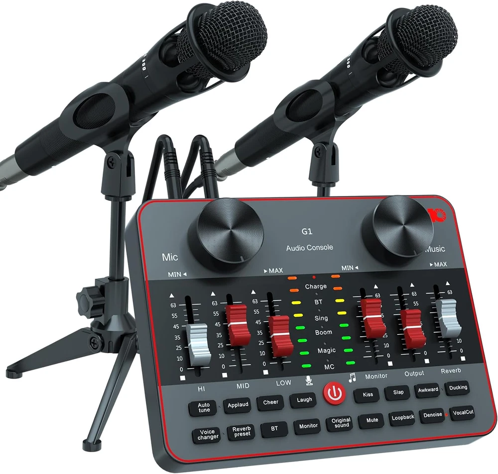 Store New Arrivals Add to Favorite View Feedback Contact Podcast Equipment Bundle for 2 Mic Tiktok Video Content Creator Kit, Audio Interface DJ Mixer Sound Card/Board Condenser Microphone for Studio Smartphone/Pc/Laptop Broadcast Recording/Live Stream Description Item model number basic streaming setup Power Source Battery Powered Supported Software tiktok/youtube/facebook/twiter Country of Origin China Operating System android/windows Top Material Plastic Product Dimensions 6"D x 5"W x 2"H Number of Channels 2 Hardware Interface 3.5-Inch Floppy, USB Body Material Plastic Hardware Platform PC, Smartphone Back Material Plastic Connector Type USB, 3.5 mm Jack Item Weight 2.99 pounds Connectivity Technology USB Model basic streaming setup Wattage 5 watts Compatible Devices phone/mic Batteries 1 Lithium Ion batteries required. Voltage 5 Volts Color Name Black 【 Made for Tik Tok Content Creator Live Sstreaming】A simple set of podcast starter kit equipment to live streaming equipment only needs a microphone live sound card, with monitoring earphone, stand, and pop filter.The Audio Interface mixer supports 2 people using to broadcast at the same time.Use a suite of vocal effects, treble/bass, reverb, 4 voice changers, 12 steps electronic music tunes, 5 sound scenes modes to get great mixing for your streaming 【Easy for use & All-In-One For Influencer kit】Podcast equipment bundle Live straming is more and popular with people, many people have joined the live streaming. -- Integrate audio interface into a DJ mixer. It offers a wealth of features and multiple controls to optimize your sound while fully controlling it. This set of podcasting comes with 2 podcasting microphones and 2 microphone clippers, and when you plug it into your PC or smartphone, you easily start the live broadcast journey. 【Live Streaming Equipment Podcast Microphone Kit for 2 mics】 live streaming need to prepare a set of live streaming equipment podcast equipment bundle for 2, The Studio Cardioid Condenser Microphone has a built-in DSP chip,that greatly reduces ambient vibration. And the heart pickup provides incredible flexibility, so the microphone can accurately capture your voice, ensuring high quality clear recordings for live streaming. The cardioid pick-up pattern minimizes background noise. 【Instrument input Accompaniment Considerate Auxiliary Functions for Youtube Starter Kit】And people basically use smartphones most of the day dj mixer, so the usage rate of smartphones is higher than that of computers.This audio interface can be directly connected to the guitar,bass, instruments, you can live stream, record, radio show, input audio from the instrument, more directly convey the authentic sound quality, perfect integration in your podcast journey.Real-time monitoring all of audio. 【Streaming Device Dj mixer easy to use On Smartphone】Mobile phone live streaming break the limitation of space, podcast microphone bundle work well with phone plug and play dj mixers equipment easy to operate and adjustment podcast bundle are visualized. battery is enough to work long.audio console work well on PC computer/laptop/smartphones tablets. Great for online podcast/voice over/ YouTube/Facebook/Instagram/Tiktok.Start your content creation when hook it up the smartphone or PC. 【Start Whole New Live Streaming Journey Podcast Kit for Beginners setup】 -- If you ever wanted to dip your feet into podcasting, this kit is all you need to get started. It can both create a live concert singing atmosphere and help you change your voice in an online game. It's the best gift for YouTubers, broadcasters. 【Professional Upgraded sound card for live streaming w Podcast Microphone Set up】--The Condenser Microphone has been designed professional sound chipset, which lets the microphone hold a 120kHz sample rate and 24-bit bitrate, ensuring your voice is captured in high detail.Hassle-free setup for plug-and-play connections. 【All-in-one Podcast Sound Board for Streaming Starter Kit】A cost-effective bundle for new or a seasoned who wants to live stream or podcast or make videos etc. IN THE BOX: 1 * G1 audio console, 2 * E300 condenser microphone, 2 *mic tripod, 2 *mic clip, 1 * 3.5mm earphone(118"), 1 * mini remote controller, 1 * USB-C charging data cable(49.6"), 2 * 3.5mm TRRS audio cable(42.1"), 1* black OTG nylon thread, 1 * user manual. Product Description G1-E300 Dual Microphone Bundle, with Intuitive, Easy-to-use, and Full Audio Solution Portable One-stop Workstation The G1 audio console is a one-stop workstation that allows for the recording and mixing of sound sources without complicated settings. It provides all audio-related operation and workflow needed, with intuitive and easy control, from audio inputting, processing and outputting, for live streaming, podcasts, voice over and other applications. To get great and entertaining mixing for your streaming live, and you don‘t need to be an audio engineer to operate it with absolute ease. Multifunctional Mixer Make Your Streaming Easy Filter different background noise to clean your audio through 3 Denoise keys; Auto ducking mic audio via Dodge button; Input PC internal system audio through Loopback key; remove singer's vocals in current background music song via Remove vocals key to cover song. Enough Ports For Audio Transmission G1 has 8 jacks for audio inputs and outputs, allow you mix and record mic inputs, input external audio to mix from your phone or PC, and monitor all audios via monitor port to optimize your audio creation, as well as internal atmosphere sound effects via the trigger pads to enliven atmosphere. G1-E300 dual microphone kit is a cost-effective and value of money sound mixer kit, this set of podcasting comes with 2 podcasting microphones and 2 microphone clippersfor beginner who want start their steps into live streaming, podcast, simple music or radio shows, on smartphone, PC, or tablet, intuitive and simple without complex settings or 
