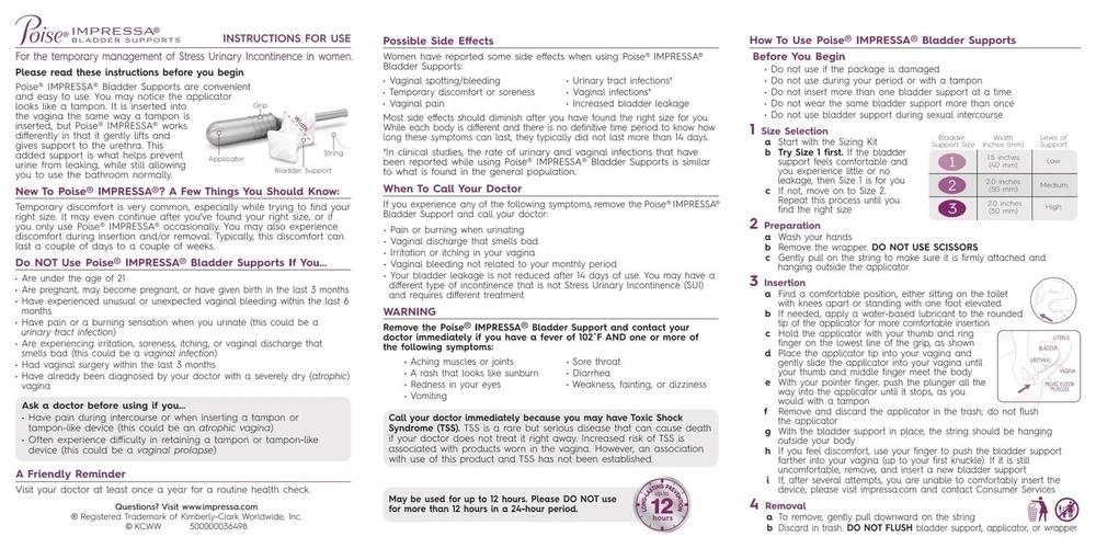 Poise Impressa Bladder Supports Sizing Kit, 1 Each of Size 1, 2, 3 Total 3 Count Poise Impressa Bladder Supports Sizing Kit, Includes 1 Each of Size 1, 2, and 3 Total 3 Count (Packaging May Vary): As a woman always on the go, you need a revolutionary incontinence product that keeps up with your active lifestyle. Poise Impressa Bladder Supports are a comfortable alternative to incontinence pads for women that protects you from bladder leaks before they happen. If you experience overactive bladder when you laugh, cough, sneeze, run or swim — known as Stress Urinary Incontinence (SUI) – Impressa Bladder Supports are for you! Insert Impressa easily into the vagina, like a tampon, to gently lift and support the urethra and to stop bladder leakage while allowing you to use the bathroom as usual. Whether you are running on the treadmill, running errands or running after kids, Impressa provides a comfortable, disposable incontinence solution that eliminates the need for bulky bladder control pads. Poise Impressa can be worn for up to 12 hours within a 24-hour period.Don't know where to start? Try the Poise Impressa Sizing Kit which includes all three sizes, one of each size. Impressa always ships in a discreet box. Help Stop Bladder Leaks Before They Happen : This non-absorbent bladder support works by inserting easily into the vagina and supporting the urethra. Live Your Active Life : Don’t let bladder leaks slow you down! Nine in ten women said their bladder leakage was reduced or stopped after using Impressa Bladder Supports. Find The Right Support For You : With the Poise Impressa Sizing Kit, discover the incontinence protection that’s right for you with 3 sizes to test. Safety Information : Insert Impressa easily into the vagina, like a tampon, to gently lift and support the urethra. Impressa can be worn for up to 12 hours within a 24-hour period. Dispose of Impressa after use. Do not use Impressa for longer than recommended to avoid potential health issues. If you experience discomfort or irritation, discontinue use and consult a healthcare professional. Always wash hands before and after use to maintain hygiene. Directions : Insert Impressa easily into the vagina, like a tampon, to gently lift and support the urethra. Impressa can be worn for up to 12 hours within a 24-hour period. Dispose of Impressa after use.