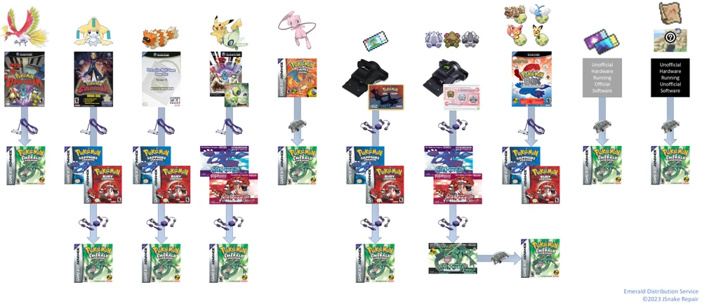 Disclaimer : This is a SERVICE; you will receive DIGITAL IN-GAME ITEMS ONLY. NO PHYSICAL GAME OR CARD is included in this listing. The physical items used in the service are NOT FOR SALE. You must ship your game(s) to us to receive the digital items If you need a new battery see our other listing 7-31-23 Update: We are now offering optional UNRELEASED content. These are originally programmed items/Pokemon/events that never made it into the final English version of the games. Our Guarantee: All Pokemon offered in this service meet the following criteria: 1. Have been distributed via stated means (see Origin column of chart) 2. Are unique and not cloned (have unique SID's) 3. Can be transferred upwards to Pokemon Home Purchasing of this listing requires you to send in your Authentic NTSC-U copy of Pokemon Emerald for the Game Boy Advance to receive the following downloaded to your game: Pokemon : Name LV OT Item Origin Note Jirachi 5 WISHMKR Ganlon/Salac Berry Pokemon Colosseum Bonus Disc Zigzagoon 5 RUBY/SAPHIRE Liechi Berry Interactive Multi-Game Demo Disc Version 14 Shiny Mew 10 MYSTRY Toys R Us Pokemon Fire Red Distribution Cartridge セレビィ(Celebi) 10 アゲト (Ageto) Japanese Pokemon Colosseum Bonus Disc ピカチュウ (Pikachu) 10 コロシアム (Colosseum) Light Ball Japanese Pokemon Colosseum Bonus Disc Ho-Oh 70 MATTLE Pokemon Colosseum Celebi 10 AGATE Pokemon Colosseum with Cheat Code UNRELEASED Pikachu 10 COLOS Light Ball Pokemon Colosseum with Cheat Code UNRELEASED Togepi 20 WES (Standard Capture) Pokemon Colosseum with Cheat Code UNRELEASED Mareep 37 WES (Standard Capture) Pokemon Colosseum with Cheat Code UNRELEASED Scizor 50 WES (Standard Capture) Pokemon Colosseum with Cheat Code UNRELEASED Zigzagoon Egg 5 (Your ID) Pokemon Box Ruby & Sapphire Swablu Egg 5 (Your ID) Pokemon Box Ruby & Sapphire Skitty Egg 5 (Your ID) Pokemon Box Ruby & Sapphire Pichu Egg 5 (Your ID) Pokemon Box Ruby & Sapphire トゲピー (Togepi) 20 Japanese Pokemon Colosseum e-Reader Card Coming Soon メリープ (Mareep) 37 Japanese Pokemon Colosseum e-Reader Card Coming Soon ハッサム (Scizor) 50 Japanese Pokemon Colosseum e-Reader Card Coming Soon Lugia 50 WESLEY (Standard Capture) Pokemon XD Coming Soon Cyndaquil 5 WESLEY (Standard Capture) Pokemon XD Coming Soon Chikorita 5 WESLEY (Standard Capture) Pokemon XD Coming Soon Tododile 5 WESLEY (Standard Capture) Pokemon XD Coming Soon Items : Name Origin Note Regi Dolls Decoration Present Card Eon Ticket Eon Ticket Card Mystic Ticket Unofficial Hardware flashed with Official Mystic Ticket Wonder Card Distribution ROM Aurora Ticket Unofficial Hardware flashed with Official Aurora Ticket Wonder Card Distribution ROM Old Sea Map Unofficial Hardware flashed with Localized, Unofficial version of the Japanese Old Sea Chart Wonder Card Distribution ROM UNRELEASED Altering Cave Spawn Changer Unofficial Hardware flashed with a custom implementation of the unused Altering Cave Wonder Card Distribution UNRELEASED *Battle e Trainer Unofficial Localization of Original Japanese Pokemon Emerald Battle-e Card Coming Soon Mystic & Aurora Ticket Information *WHAT DOES UNOFFICIAL FLASHED WITH OFFICIAL MEAN? The original Wonder Card Distribution Hardware for both tickets has had its software dumped. We have installed that same software onto a similar, non-propriety piece of hardware. We will use this setup to transfer the Mystic/Aurora Ticket Wonder Cards to your game via Mystery Gift (two GBA's with Wireless Adapters) Result: Your game will not be able to tell the difference from the proprietary hardware No cheat/hack tools will be used on your game Your save file will not be modified by an external editor Old Sea Map Information *WHAT DOES UNOFFICIAL FLASHED WITH LOCALIZED, UNOFFICIAL MEAN? The original Japanese Wonder Card Distribution Hardware for the Old Sea Chart has had its software dumped. That software has been localized for NTSC-U Emerald versions We have installed that same software onto a similar, non-propriety piece of hardware. We will use this setup to transfer the Old Sea Map Wonder Card to your game via Mystery Gift (two GBA's with Wireless Adapters) *ARE BOTH THE OLD SEA MAP AND SUBSEQUENT MEW LEGAL? This event is classified as 'Un-Released' Un-Released content is completely legal as far as the game and Nintendo's services are concerned, as it was programmed by Nintendo and subsequently generated by the game Any Faraway Island Mew that is in English is certainly not obtained legitimately, but is certainly a legal Pokemon. Result: Your NTSC-U game now has access to an NTSC-J exclusive event No cheat/hack tools will be used on your game No further modifications other than adding the Localized Wonder Card will be made to your save Altering Cave Spawn Changer Information What is it? The Altering Cave was designed to be used with an unused Mystery Gift Feature Receiving the Mystery Gift changes the Pokemon found in the cave Fans have created a custom event that serves the original purpose What does this do? Adds a person to the top of the Pokemon Center Talking to this person changes the Pokemon found in Altering Cave, from a list of 9 This person can be talked to (and the Pokemon changed) as many times as you like. If you still do not wish for the tickets or the spawn changer you can specify in a message. Logistics : You are responsible for shipping to me, I will cover the cost back to you. Turnaround time is 1 business day from receiving your game. By default handling time is set to 10 days to allot for slower buyers. Requirements : You must have beaten the Elite Four to receive everything; 5 Gym badges will get you everything but National Dex Pokemon Working Battery and Synchronized RTC is NOT required; if you would like this done as well please let us know. Helpful But Optional : Have 6 Pokemon in your party, all of which can be traded away permanently Unlock Mystery Gift Have 3 Unused Decorations in your PC, all of which can be traded away perma