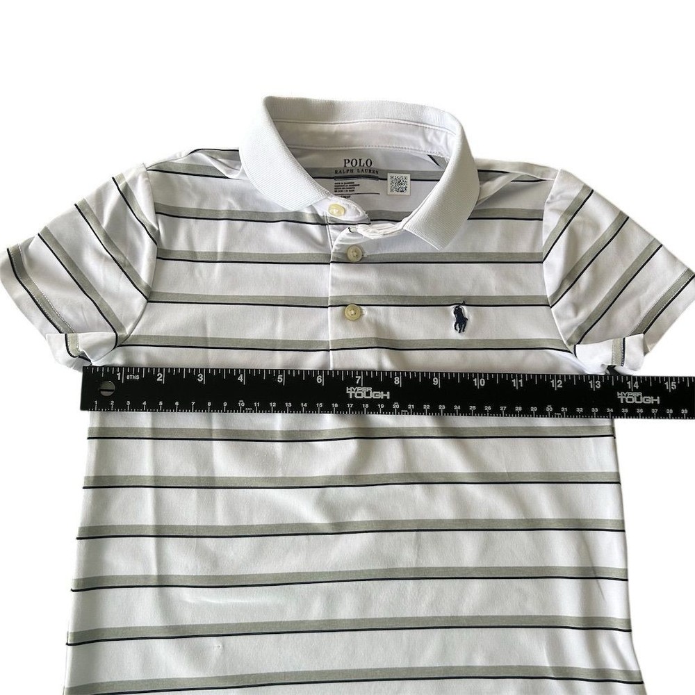 Introduce your little one to timeless style with this Polo Ralph Lauren Boys' Polo in classic white. Crafted from soft cotton, this polo features a collared neckline and short sleeves, perfect for keeping cool and comfortable. The iconic Polo logo and ribbed collar add a touch of sophistication, while the regular fit ensures easy movement. Ideal for family gatherings, school events, or casual outings, this striped polo is a versatile addition to any wardrobe. The polo is in good condition with a small snag and stain, adding character to this charming piece. Keywords: Polo Ralph Lauren, boys' polo, white polo, cotton polo, short sleeve, collared shirt, iconic logo, ribbed collar, striped pattern, casual wear, family gatherings, school events, versatile style, machine washable. Brand: Polo Ralph Lauren Color: White Department: Boys Size: 5 Type: Polo Sleeve length: Short Sleeve Material: Cotton Neckline: Collared Style: Basic Features: Iconic Polo Logo, Ribbed Collar Fit: Regular Pattern: Striped Accents: Logo Garment care: Machine Washable Smoke free household. Pet friendly household. Please see pictures for measurements. Feel free to reach out with any questions and we’ll try to answer as best we can.