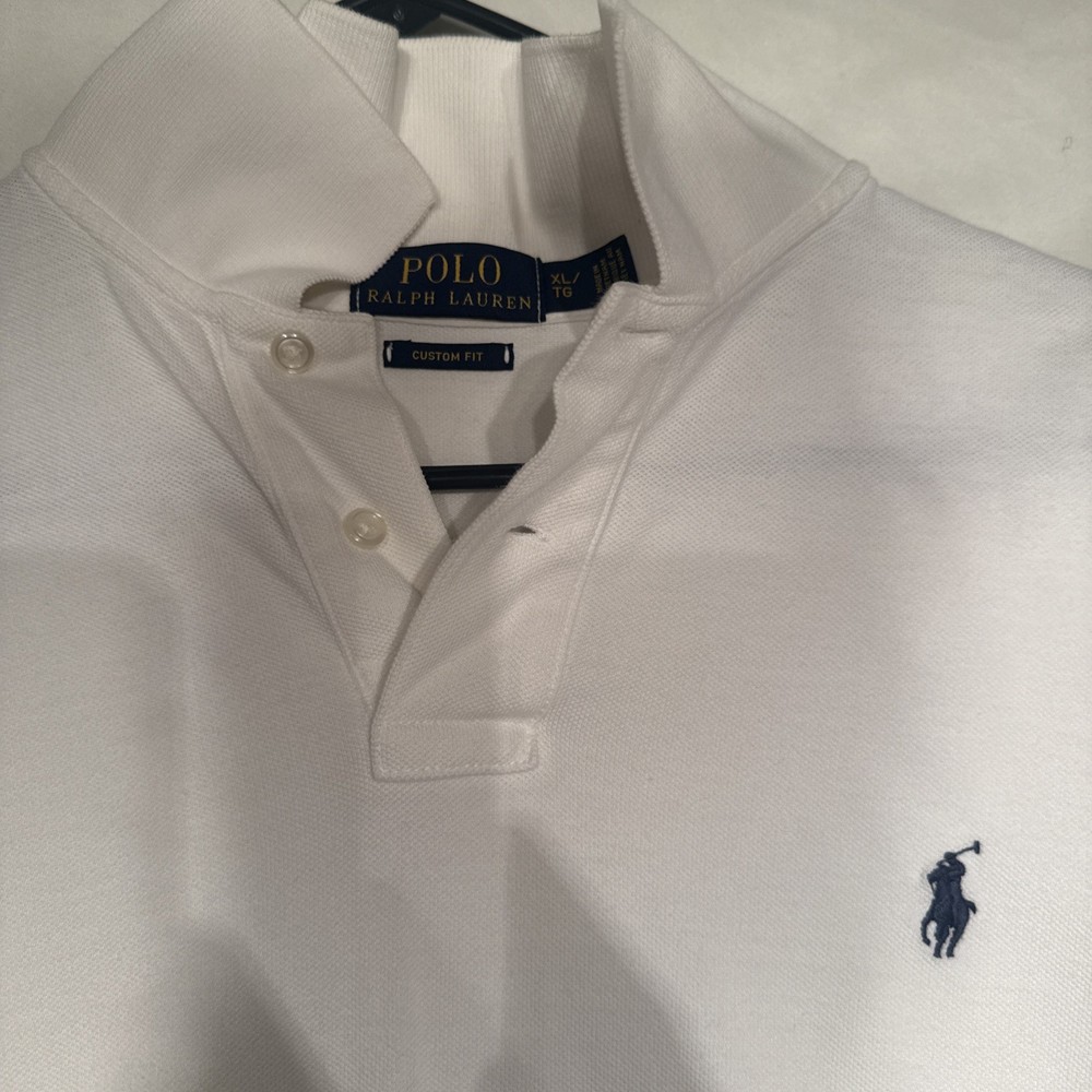 great condition XL men's polo collared buttons White 42 inch chest 24.5 inch from top of shoulder to front hem 27 inch from top of shoulder to back hem sku b-022