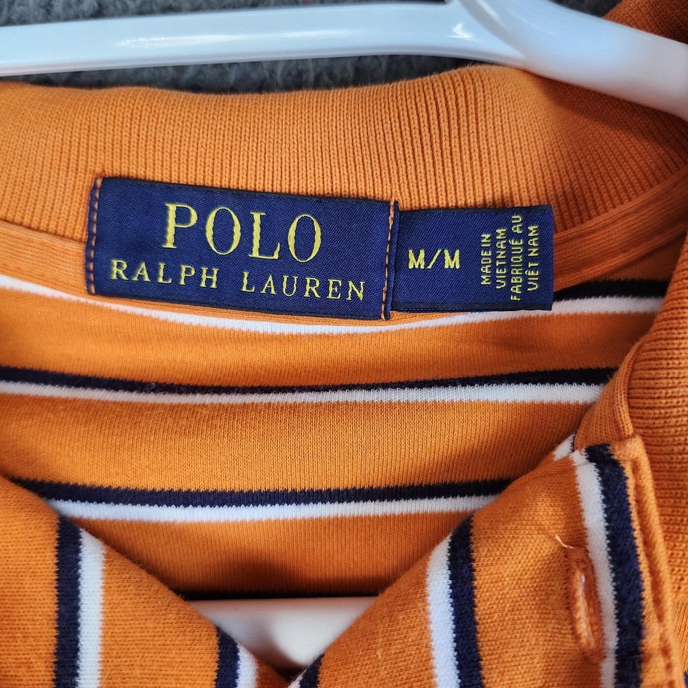 Brand: Polo Ralph Lauren Item: Mens polo shirt in orange with white and navy horizontal stripes, featuring the navy embroidered pony logo at the chest. Size on tag: M/M (Medium) Made in Vietnam. Details: Short sleeves, ribbed collar and cuffs, two-button placket, side-hem vents, straight hem.