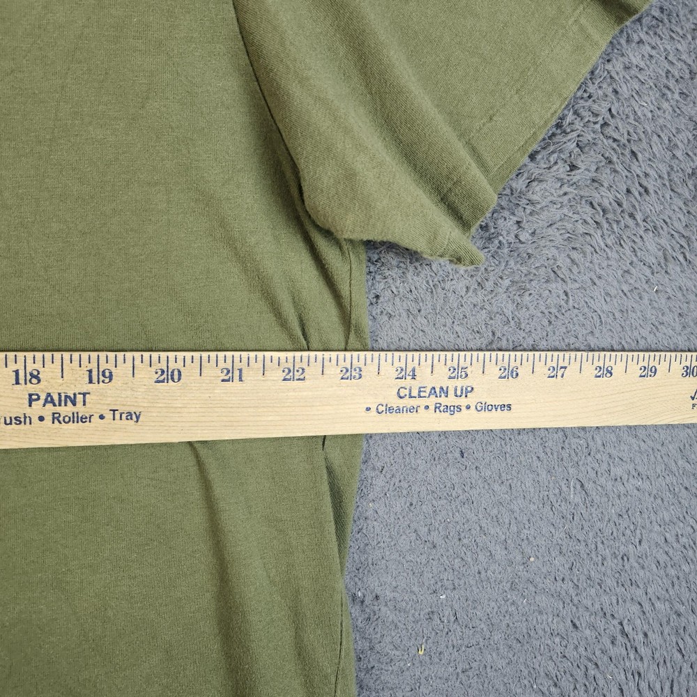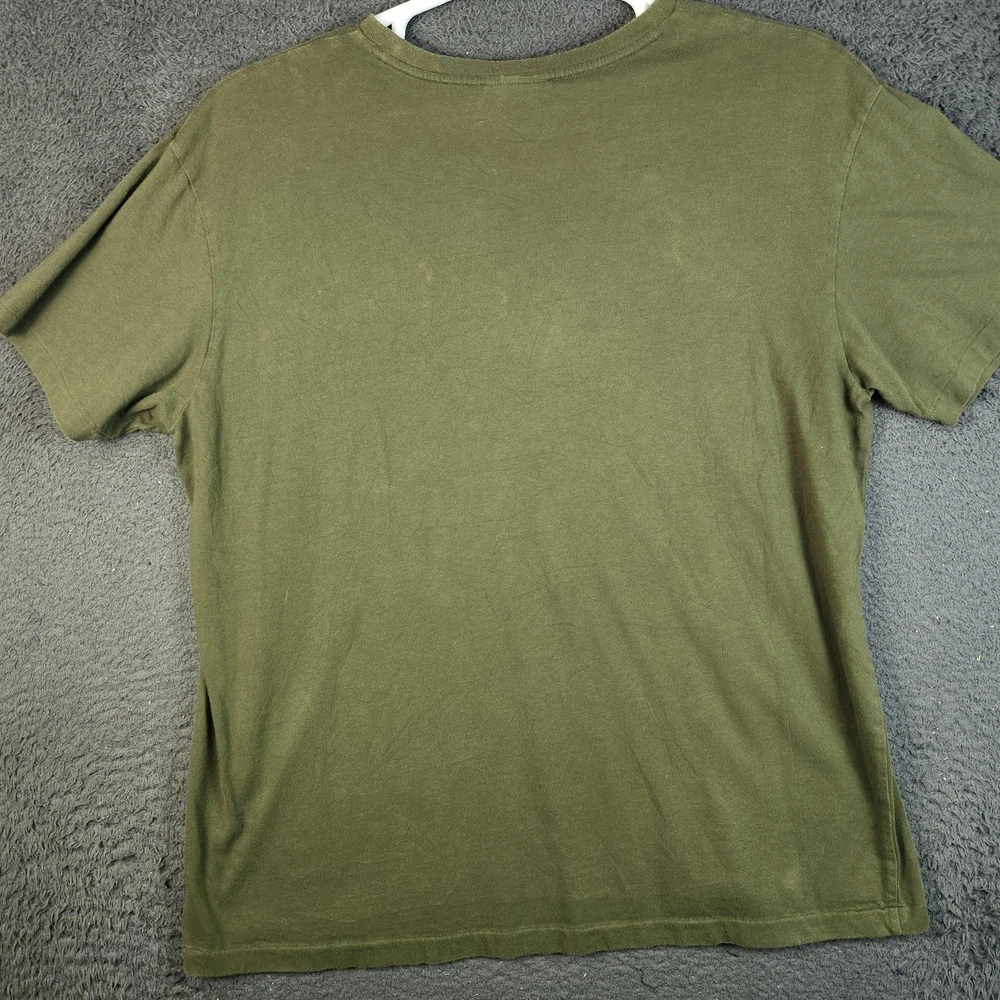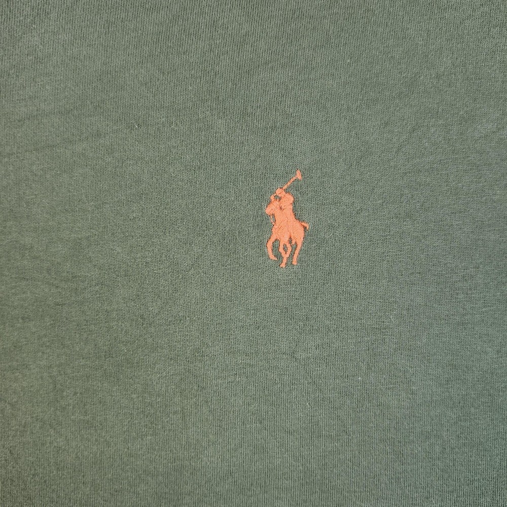 Brand: Polo by Ralph Lauren Item: Mens short-sleeve V-neck shirt in olive green with signature orange embroidered pony at chest. Material: 100% cotton; Made in Vietnam. Size on tag: Large Details: Soft cotton knit, V-neck, short sleeves, straight hem, classic casual style, embroidered chest logo.