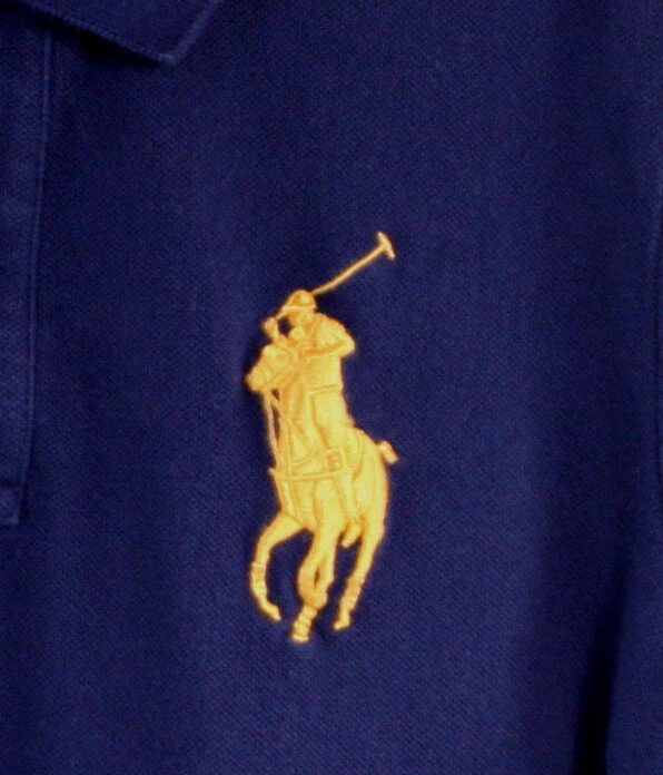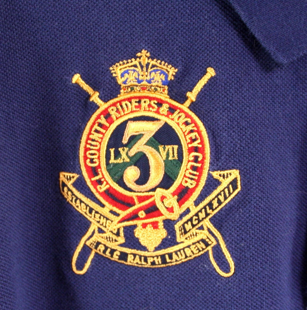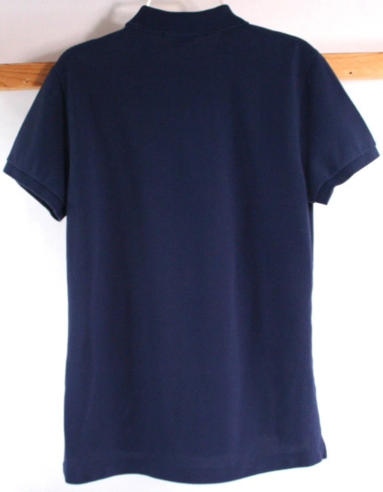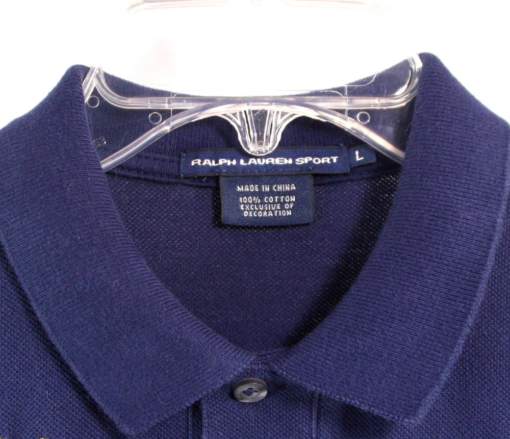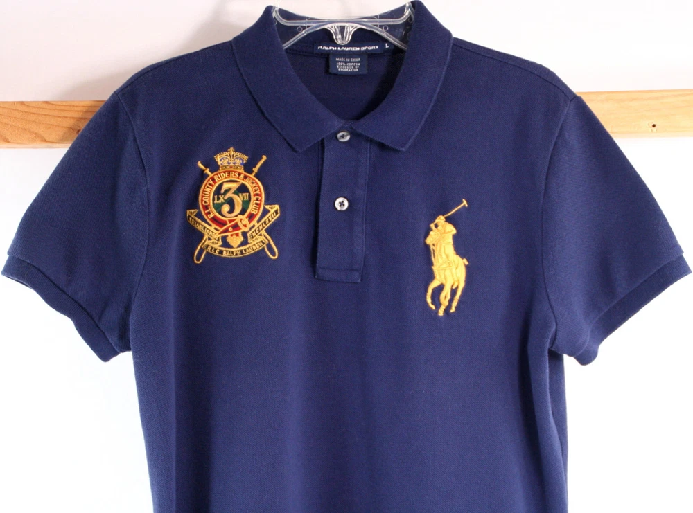 Polo Ralph Lauren Sport Youth / Boy's Polo Shirt -Navy Blue- Big Pony-Size Large. Color is a navy blue with a big gold polo player embroidered on the left front chest and a gold logo patch on the right that says "R.L. County Riders & Jockey Club"- short sleeves - 100% cotton - uneven vented hem - 2 button placket. In excellent condition. May have been worn once or twice. A Ralph Lauren icon, this Polo shirt is crafted with comfortable cotton mesh and machine washable. Top of shoulder to bottom hem measures approx. 23.5" in front and back length is 25". Chest measures from underarm to underarm 18". Details: 100% cotton. Machine washable. Signature embroidered Pony at the left chest. Ribbed Polo collar. Two-button placket. Short sleeves with ribbed armbands. Tennis tail. Visit our eBay store for more collectibles. Combine shipping and save!