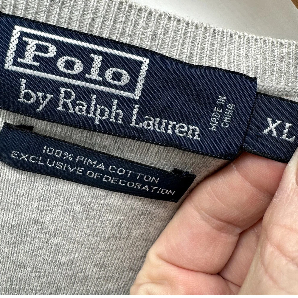 Polo Ralph Lauren Sweater Mens XL Gray V-Neck Pima Cotton Vest Pullover Knit Very good condition, see all pictures for views. •Pit to pit: 22" •Shoulder to hem: 26" Ships out same day or next open postal day. Thank you for your purchase, we appreciate you!
