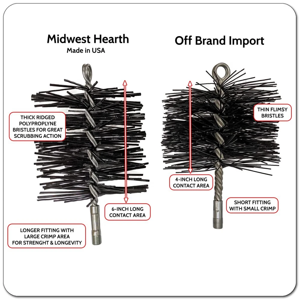 ☑ Chimneys should be cleaned at least once a year, and more often if you use your fireplace frequently. ☑ Poly Chimney Brushes are designed to be used with metal chimney flue to help prevent scratching and marring of the steel pipe. ☑ Measure the inner diameter of your flue and order the same size brush: 6" Round or 8" Round. ☑ Our chimney brushes are professional quality and feature stiff polypropylene bristles and a heavy duty galvanized steel stem. ☑ The brush will have 1/4-Inch male pipe threads at the end that may be attached to extension rods. ☑ offers an 18-Foot fiberglass rod extension kit that is with these brushes (sold separately). POLYPROPYLENE BRUSH - Stiff poly bristles clean coal and soot from metal stove pipes, flue, and chimneys GALVANIZED STEEL STEM - Heavy duty double-spiral stem for long-lasting durability 1/4 INCH NPT FITTINGS - Features 1/4" male pipe threads for use with our fiberglass rod kits (sold separately) PROFESSIONAL QUALITY - Superior components provide excellent performance MADE IN USA - Quality manufactured in the Midwest!
