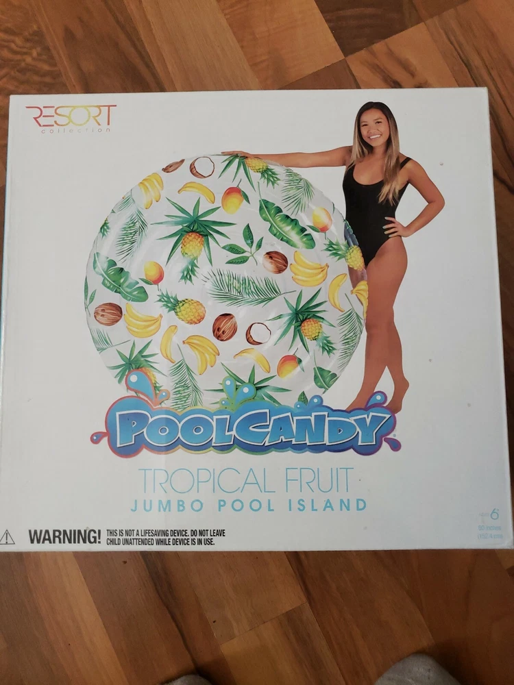 Pool Candy Tropical Fruit Jumbo Pool Island NEW Float Pineapple Coconut Bananas. Relax in the tropical sun with this Deluxe Jumbo Island Inflatable Floating Raft. Featuring a palm print design, this giant float provides room for ultimate relaxation all summer long! 60 Inches Ages 6+