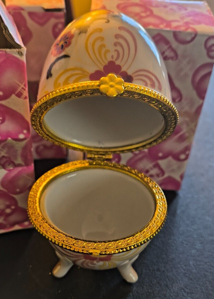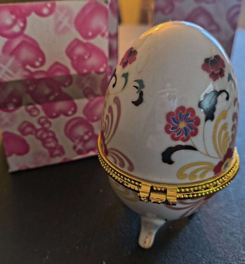 Porcelain Floral 3-Foot Hinged Egg Trinket Box 4" Tall NIB